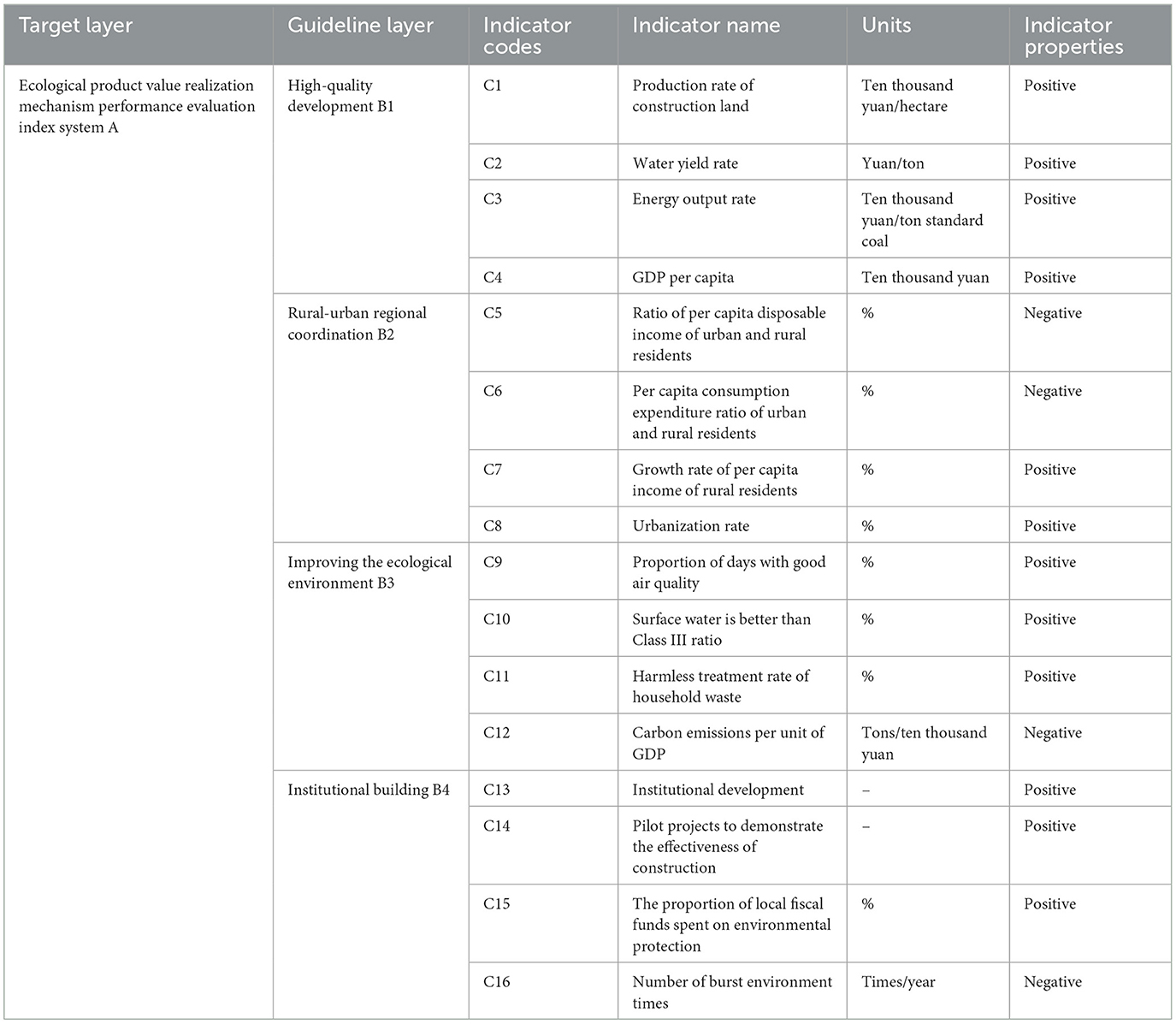 To comprehensively consider the performance of ecological product value realization from multiple dimensions. Indicators such as the construction land output rate in the dimension of high-quality development can measure the efficiency of resource utilization and the quality of economic development; Indicators such as income of urban and rural residents in the dimension of urban-rural regional coordination can reflect the balance of development; Indicators such as the number of days with good air quality in the dimension of ecological environment governance can reflect the effectiveness of ecological protection; The indicators of institutional construction in the dimension of institutional mechanism construction can evaluate policy guarantees and management capabilities. These indicators take into account the economic, social, ecological, and institutional levels, with both positive indicators for measuring effectiveness and negative indicators for reflecting problems, forming a comprehensive and targeted evaluation system. This paper constructs the three-level ecological product value realization performance evaluation index system as shown in Table 1.