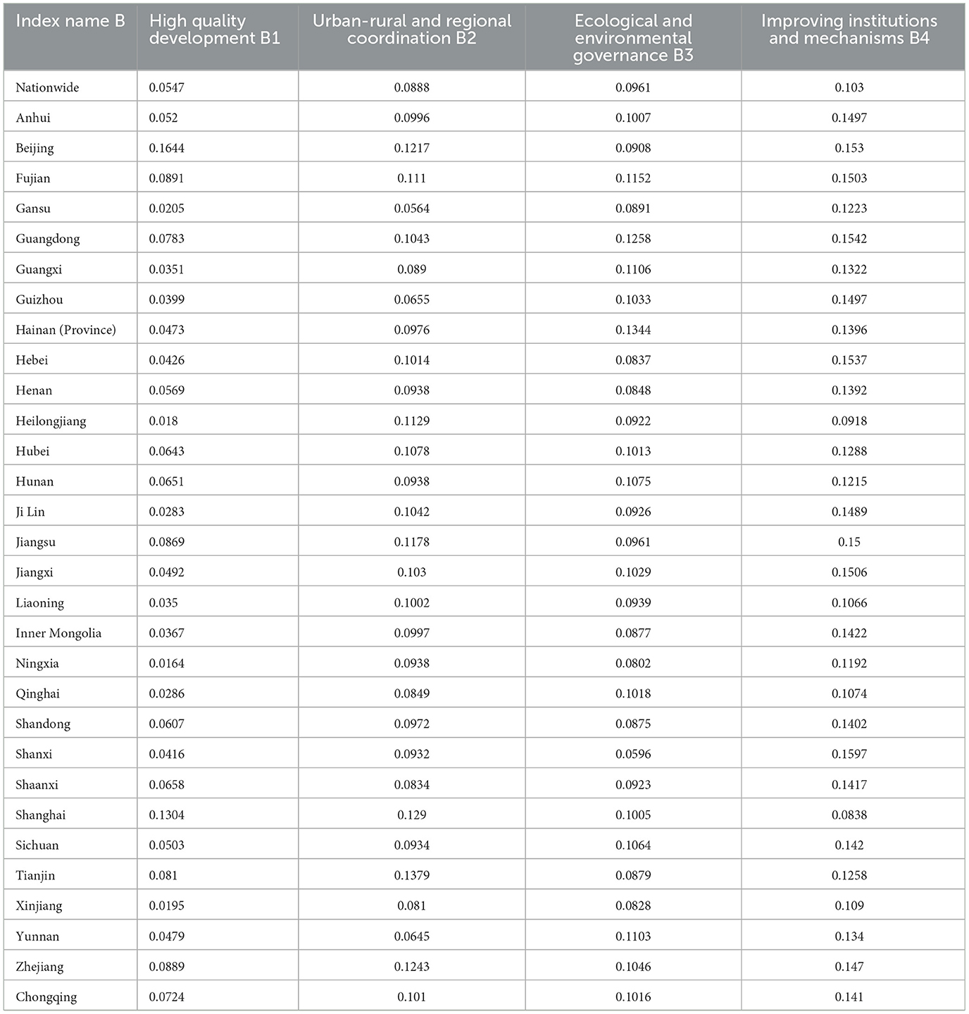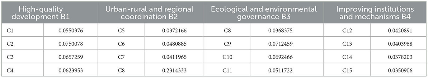 Through dimensionless standardized processing of the original data, entropy weight method is used to determine the corresponding weights of high-quality development, urban-rural and regional coordination, ecological environment governance, and institutional and mechanism construction, and the results are shown in Table 2.
