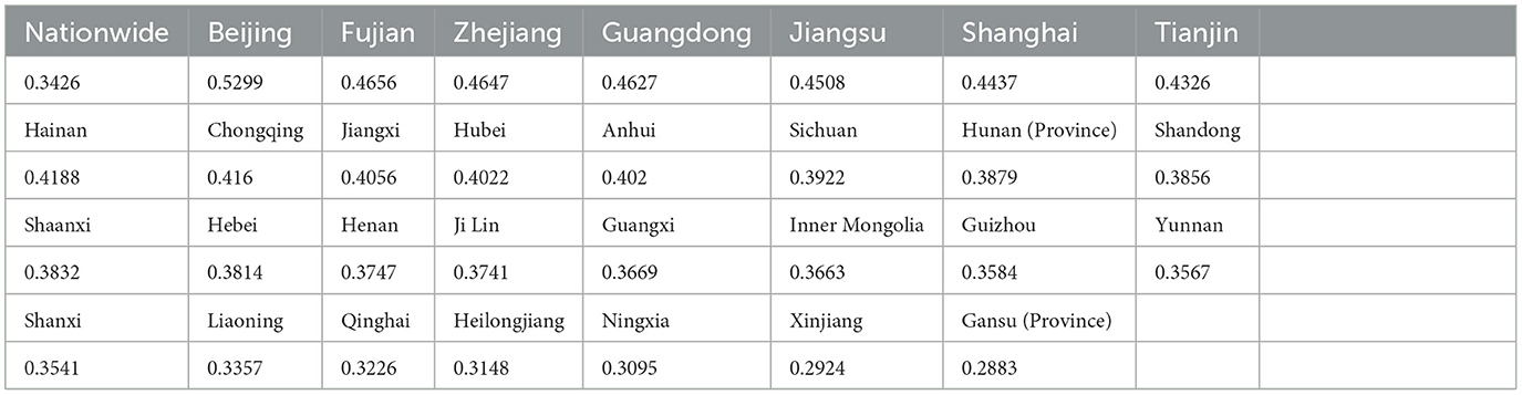 The growth rate in 2012 was −0.011084, showing negative growth, or due to the lack of systematic mechanisms for realizing the value of ecological products, policy and practical paths to be explored, and limited implementation effects. In 2013, the growth rate turned positive to 0.105514 due to the central government's proposal of “building a beautiful China,” the inclusion of ecological civilization in the national strategy, and local pilot projects such as ecological compensation. In 2014, the growth rate reached 0.383104, which was the peak of the stage, due to the issuance of the “Opinions on Accelerating the Construction of Ecological Civilization,” which clarified the requirements for realizing the value of ecological products, accelerated the implementation of local ecological red lines and other policies, and the increase in academic research publications providing support for practice. In 2016, the growth rate was 0.077040. Based on the policies of 2015, the supporting policies of the Overall Plan for Ecological Civilization System Reform began to take effect, and the pilot program for ecological product value accounting was launched. In 2017, the growth rate was 0.172556, and the implementation of GEP accounting and other practices has been promoted, resulting in significant achievements in policy implementation. In 2018, the growth rate was 0.032949, or due to the implementation of the mechanism entering an adjustment period, some pilot projects entered the adjustment stage. The growth rate in 2019 was 0.007848, close to stagnation, which may be affected by insufficient policy implementation depth. The growth rate in 2020 was 0.079452, with a slight rebound. With the continuous promotion of ecological civilization construction, local understanding and implementation of mechanisms have been strengthened. The growth rate in 2021 was 0.001475, slightly decreasing again, possibly due to marginal diminishing effects of some policies. The growth rate of 0.216344 in 2022 has significantly rebounded, which may be related to the deepening of the “dual carbon” target and the further improvement of the mechanism for realizing the value of ecological products, and the enhancement of policy synergy.