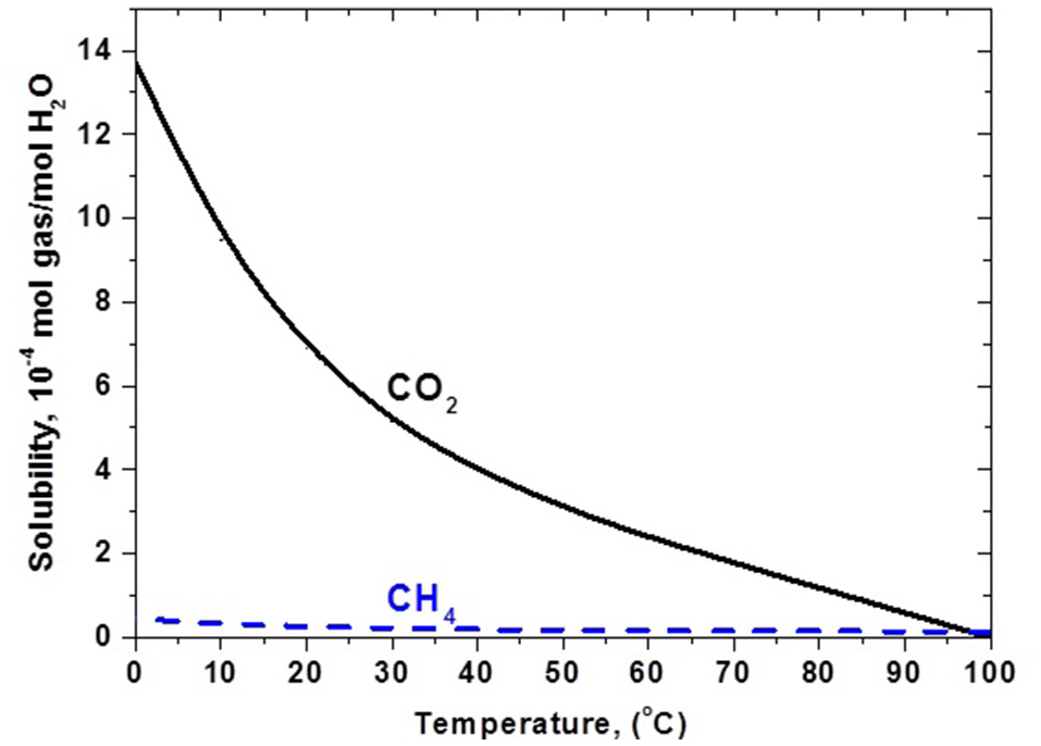Solubility of CO2 and CH4 in water. Data Source: Perry et al. (1984).