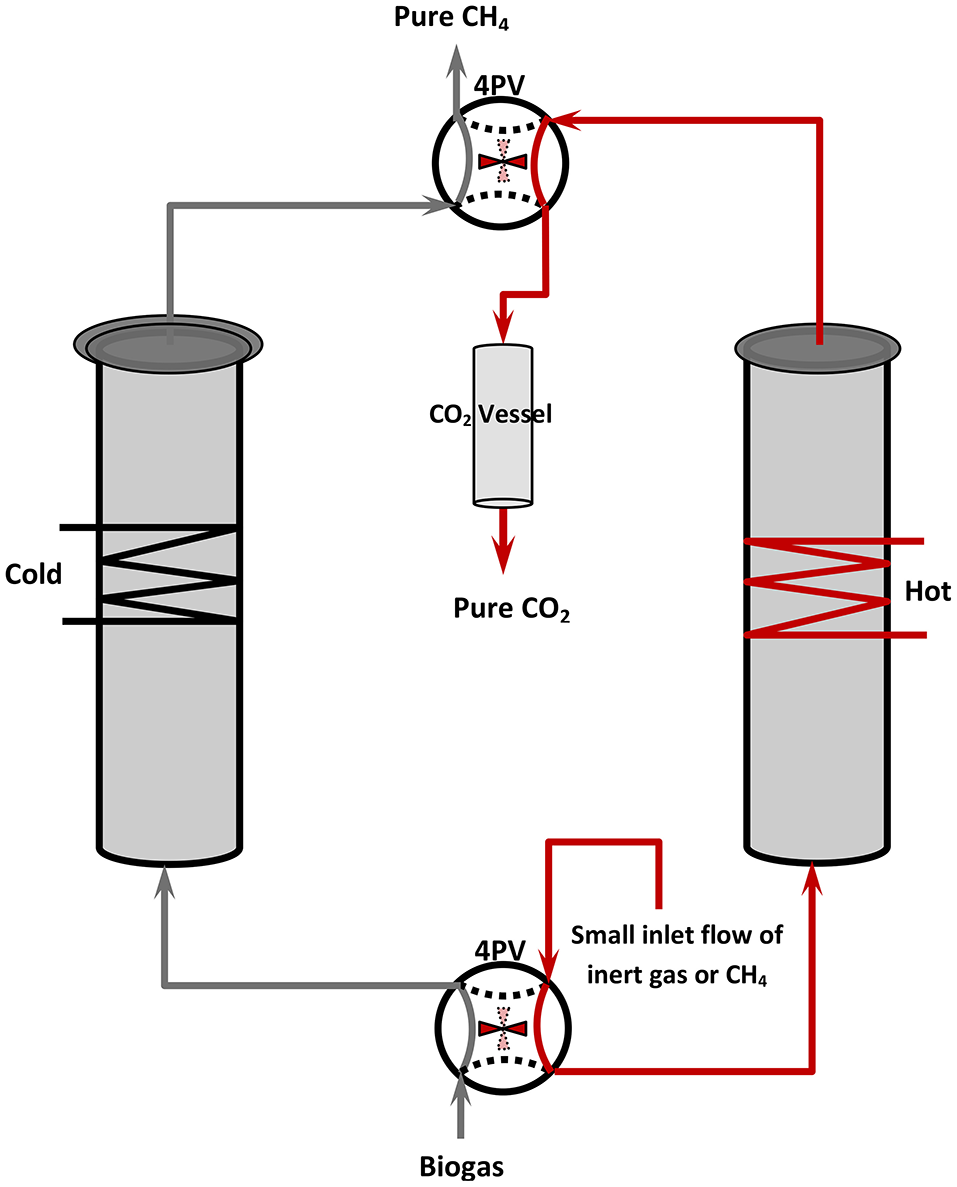 Adsoprtion-based removal of CO2 from biogas is widely practiced and commercially applied at both pilot and demonstration plant levels and is still an active research subject (Cavenati et al., 2008; Cebula, 2009; Petersson and Wellinger, 2009; Alonso-Vicario et al., 2010; Tippayawong and Thanompongchart, 2010; Grande, 2011; Montanari et al., 2010; Grande, 2012; Ryckebosch et al., 2011; Yuan et al., 2013; Andriani et al., 2014). The techniques used include PSA and TSA, both involving two packed-bed columns in a swing-type arrangement employing appropriate valve sequencing, as shown schematically in Figure 2. The operating principal is similar in the two cases, the main difference being the method used for adsorbent regeneration, i.e., either pressure or temperature variation. This two-column arrangement allows continuous-flow steady-state operation of the process, although the operation of individual columns is of course discontinuous and involves a multistep cycle. The simplest case uses a two-step cycle. One column is maintained at low temperature to continuously trap CO2 from the biogas flow (allowing free passage of CH4 through the packed bed) whilst the other is heated (TSA) or evacuated (PSA) to release previously adsorbed CO2. Note that the temperature of the bed determines its adsorption capacity—the lower the temperature, the greater the adsorption capacity of an adsorbent for a given molecule. A CO2 collection vessel is typically used, as well as a small portion of the purified methane stream (or an inert gas) in order to assist CO2 flow into the collection vessel and to purge the column, preparing it for the next cycle. In the second step, the two 4-port valves are synchronous turned to a second position such that the role of each column is reversed: the cleaned column #2 now traps CO2, whilst the previously CO2-saturated column #1 commences regeneration. The duration of the two-step cycle is a crucial design parameter that depends on the CO2 capacity of the columns. This must be appropriately determined in order to allow continuous utilization of the feedstream with continuous production of CH4 in the system's exhaust. The basic concept can be varied, especially in regard to the number of steps required for a complete cycle, and with respect to the operating sequence of the valves during each step (Grande, 2012). In addition to CH4-CO2 separation, the concept has been successfully applied in a number of other separations, for example in the purification of H2-containing streams for fuel cell applications (Nikolaidou et al., 2015); for C2H4 separation from CH4 and O2 in the oxidative coupling of methane, thus providing a one-step transformation of methane to ethylene with extremely high yields (Jiang et al., 1994); for air separation (Jee et al., 2001); for noble gas purification (Das et al., 2008); for n-paraffin/iso-paraffin separation (Yang, 2003), and others. The simplicity of PSA and its low capital and operational costs makes it very attractive in comparison to other fluid separation technologies.