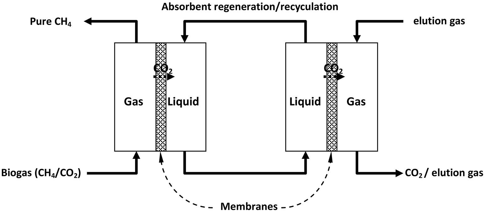 Separation of CH4 and CO2 in a combined double gas-liquid membrane process. [Reproduced with permission of Elsevier from Simons et al. (2009)].
