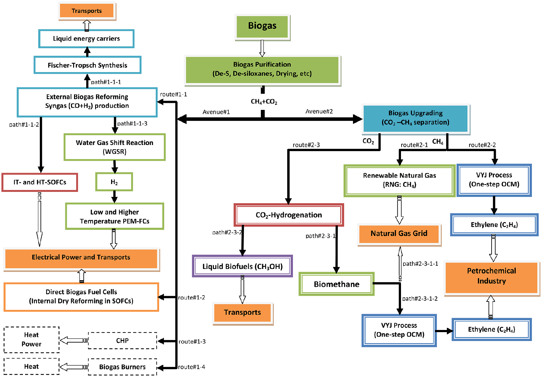The thermal heating value of biogas varies between 15 and 30 MJ/m3, close to that of natural gas (Table 1); 1 m3 of biogas is equivalent to about 0.6 L of gasoline. It is often described as Renewable Natural Gas (RNG) or Substituted Natural Gas (SNG) or even biomethane, since it is a pipeline-quality gas, which, after upgrading is fully equivalent to and interchangeable with natural gas so that it can partially substitute the latter in transport applications or grid injection. Accordingly, along with natural gas, biogas may be considered as a “bridge fuel” for the twentieth century, enabling the transition to a low-carbon energy economy, currently playing a key role in the emerging market for renewable energy. As a result, biogas purification and upgrading has been a prominent research topic in recent years. A number of comprehensive reviews are available including those provided by Abatzoglou and Boivin (2009), Ryckebosch et al. (2011), Sun et al. (2015); Andriani et al. (2014) and Salihu and Alam (2015). However, although biogas purification and upgrading has been extensively reviewed, its advanced utilization as a renewable energy vector and for the production of added-value chemicals has received much less attention. The latter aspect is the principal focus of the present review: after concisely reviewing state-of-the-art purification and upgrading methods, in-depth consideration is given to the exploitation of biogas in the renewable energy and chemicals sectors. With respect to the former, particular emphasis is given to direct biogas solid oxide fuel cells which currently attract much research effort, although the information dispersed in the primary literature rather in reviews. Concerning the latter, the most promising potentially practical and environmentally benign utilization routes are reviewed here and an informative process sequence network is provided. Although some of the chemical routes are not new, they have not been previously considered for biogas utilization—for example transformation of biogas to ethylene via one-step process.