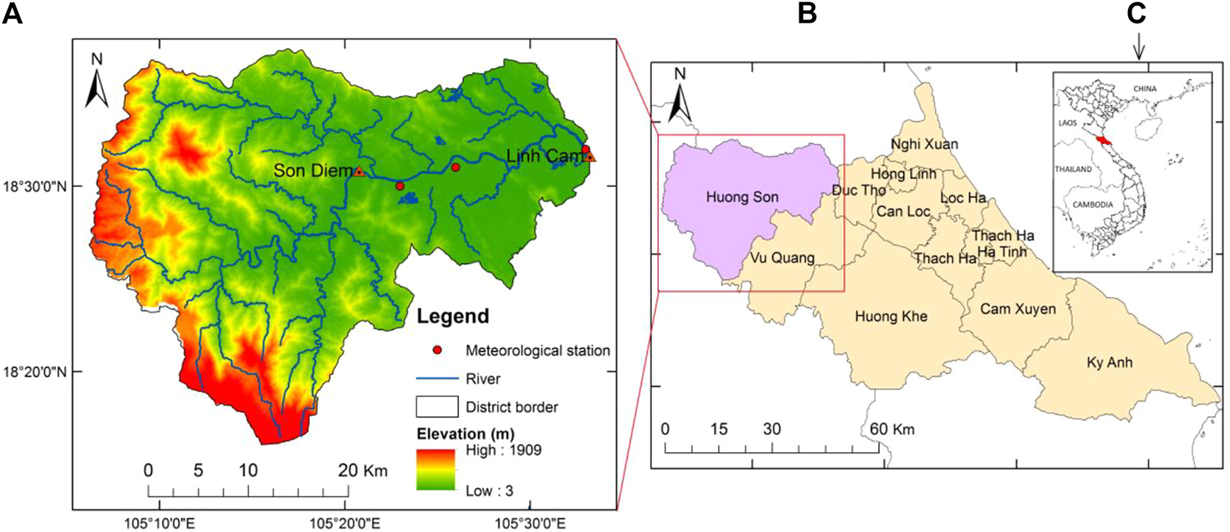 Characteristics of Huong Son district (A) geographic location of Huong Son district in Ha Tinh Province (B) and geographic location of Ha Tinh Province in Vietnam (C).