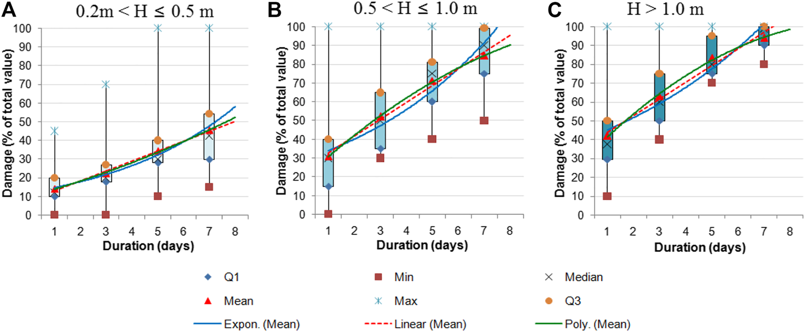 The loss coefficient E(Ht) is calculated based on a stage-loss function. In the present study, three types of function were developed which are exponential function, polynomial function and linear function. Among the three types of function developed, the linear function has the highest coefficient of determination R2 for all depth levels. It was therefore selected for economic loss calculation. The linear function E = F(t)= a.t + b, where E is the loss coefficient in percentage (E ≤ 100%), t is the inundation duration (days), a and b are coefficients determined for each water depth level. In the present study, flood depth (H) was divided into three levels: Level 1: 0.2m < H ≤ 0.5 m; Level 2: 0.5 <H ≤ 1.0 m; and Level 3: H > 1.0 m. The study assumption is that the flood level shallower than 0.2m caused no economic loss to rice. The loss curves and functions were built from interview survey data with local farmers. 195 farmers in the district whose rice fields were often inundated by annual flooding were randomly selected for investigation. Figure 5; Table 1 present loss curves and loss function for rice production. The curves clearly show a combined effect of flood depth and flood duration on the loss of rice production. As the flood is higher and longer, the loss is greater. However, the loss and its increase along with flood duration for flood depth below 0.5 m are much smaller compared to flood depth above 0.5 m. Little effect of shallow flood on rice is due to the fact that rice varieties grown in the study area usually have a height of over 80 cm and are wet rice, which has the ability to tolerate flooding for a certain period of time. This is also an indication for adaptation that tall rice varieties should be cultivated for the flooding-sensitive areas.