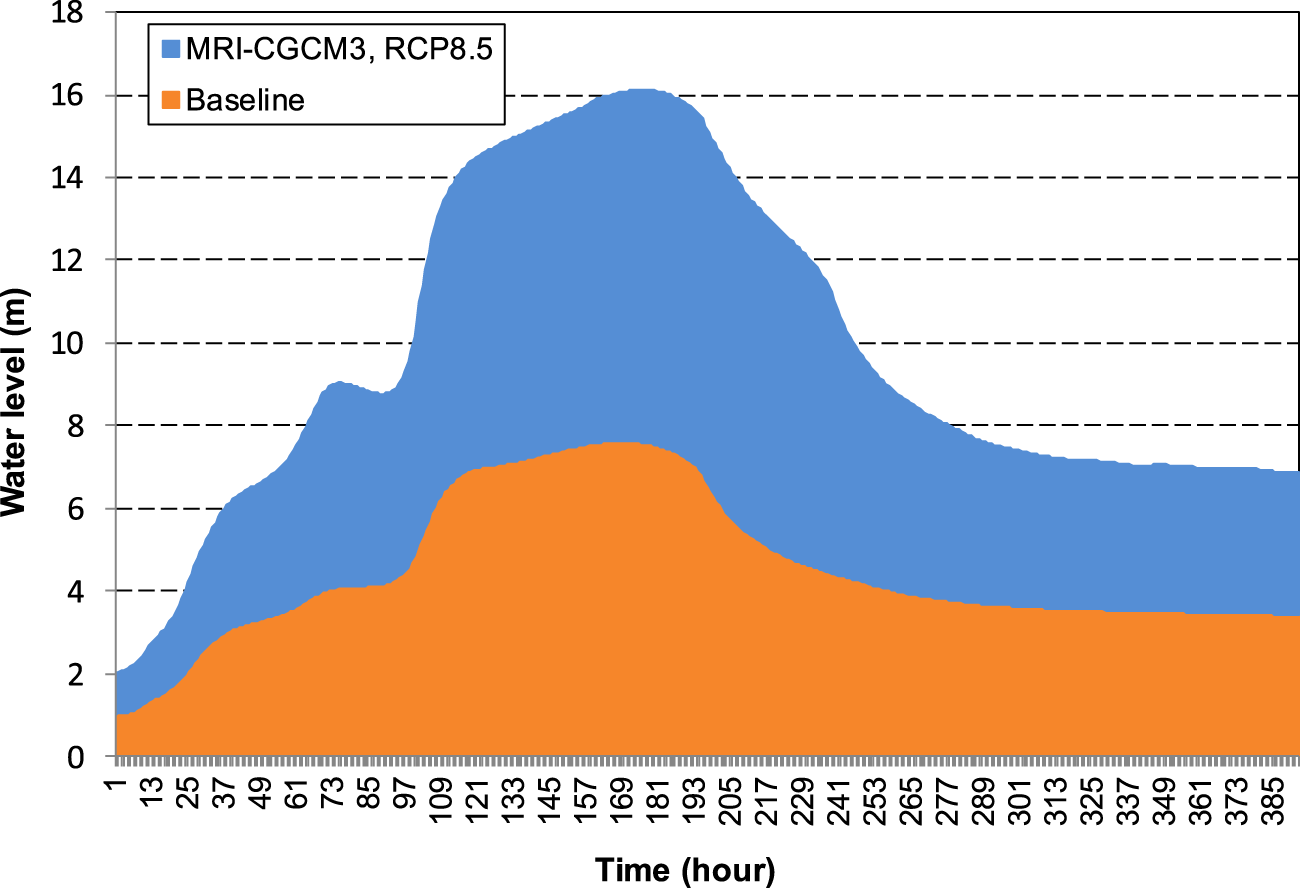 Inundation depth under baseline and MRI-CGCM3, RCP8.5 scenarios.