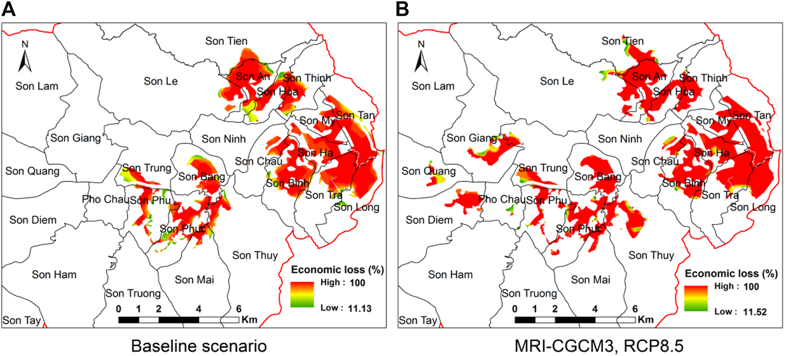 Results from MIKE FLOOD model provided depth and duration of the flood at each mesh grid of the model. These data were then used for the generation of maps of depth and duration using spatial interpolation method. The maps are shown in Figures 9–12. From the Figures, it can be seen that the depth (and also duration) of inundation is heterogeneous over the flooded area for both the baseline period and future period. This is due to the heterogeneity of the topography: the lower the topography, the higher the depth of inundation and the longer the duration of inundation. Calculation results from inundation maps show that the flooded area in the baseline period was 7106.65 ha, accounting for 6.5% of the total natural area of the district. Most upstream communes are not flooded, but downstream communes are flooded with large areas. This can be explained by the characteristics of topography of the study area where the upstream areas have high terrain and steep slopes and the downstream areas are mostly low-lying valleys. During a flood event, surface runoff that forms in the upstream area will finally create cumulative flows of the main river that flood low-lying areas downstream. By 2050s, under climate change reinforcement (MRI-CGCM3, RCP8.5 scenario), flooded area would increase to 7534.64 ha (an increase of 427.09 ha (up 6.0%) in comparison with the baseline period). In addition to a significant increase in the flooded area, the maps also show an increase in flood depth and inundation time. A common characteristic of floods in downstream flood plains is that flood water recede slowly, which is the reason that when the rain lasts longer with greater intensity, in addition to the rise of water level, the flood inundation will also last longer. The increase in the area and duration of flood inundation due to climate change reinforcement was a quite popular projection among the scientific community and was reported by recent studies (Pham and Tran, 2018; Yue et al., 2019). The area of rice cultivation inundated was identified by overlaying the map of inundation and the map of land use. The loss of rice production was calculated using the stage-loss function (Table 1) for every map grid and is displayed in Figure 13. Figure 13 shows that most of the area of rice inundated will be completely damaged (the loss is 100%).