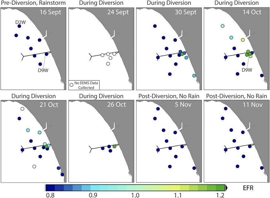 FIGURE 7. Distribution of in-situ EFR in Santa Monica Bay during the sampling window. No EEM analysis was conducted for September 24. EFR values >1.0 were only detected near the outfall during the diversion. Data from September 16 (after major rain event) show that the EFR is largely insensitive to runoff.