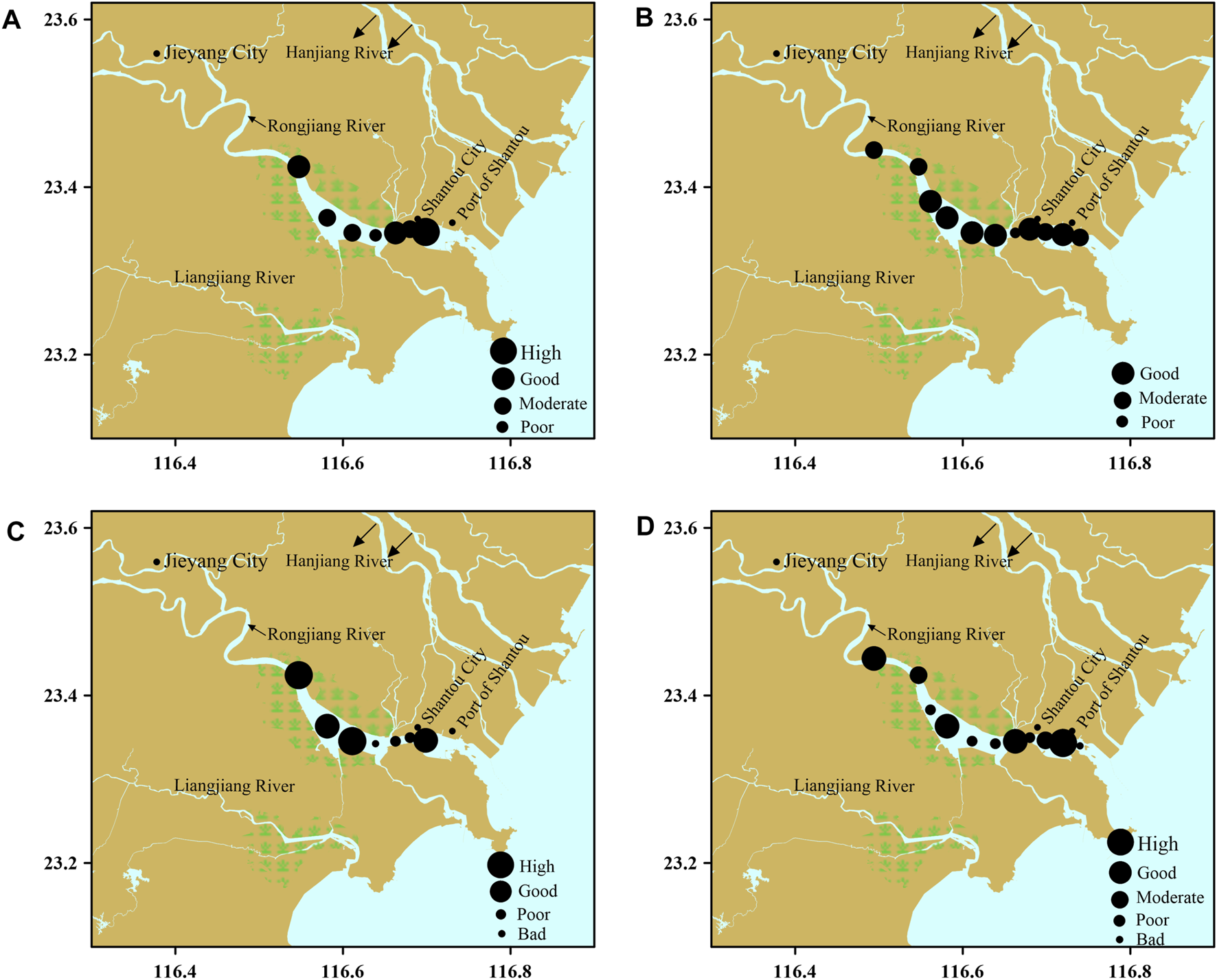 Rongjiang River, the second largest river system in Guangdong Province, flows through the urban environment between Jieyang and Shantou cities before entering the South China Sea (Wang et al., 2016). Aquaculture ponds on this river between these two cities cover approximately 21,297 ha (Gu et al., 2018). The aquaculture, industrial pollution, agriculture, domestic sewage, and other human activities surrounding this river and estuary all pose significant threats to the aquatic ecosystem (Gu et al., 2018; JYEPB Jieyang Environmental Protection Bureau 2018; STEPB 2018). Furthermore, the estuary ecosystem of this river is affected by other areas, through the water channel between this river and the Lianjiang River and Hanjiang River. The ES of the benthic ecosystem of the Rongjiang River estuary has not yet been fully evaluated because no ES assessment of the Rongjiang River estuary has been conducted using indices based on the macrobenthic invertebrate fauna, which is important for evaluating environmental health.