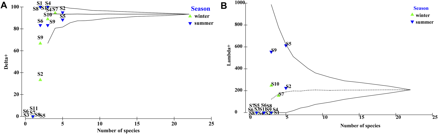 Confidence plots for summer revealed that most Δ+ values were within the 95% confidence interval, and S4 and S8 were close to the upper and lower limit of the 95% confidence intervals, respectively; S7 fell outside the 95% confidence limits. In winter, more sites (S2, S3, S5, S6, S8, and S11) fell outside the lower 95% confidence limit; S9 was close to the lower limit; and S1 and S4 were close to the upper 95% confidence limit. In some cases, the Δ+ results were complemented by those of Λ+, reflecting taxonomic unevenness. The Λ+ plot differed from the Δ+ plot because as S4, S6, S7, and S8 in summer were near the lower 95% confidence limit (Figure 3).