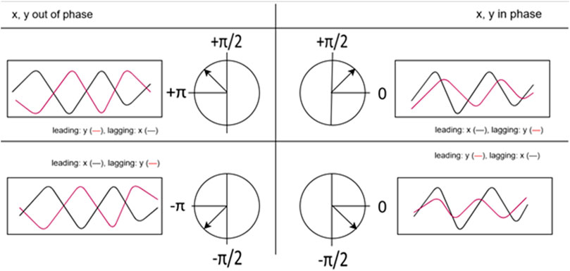 Phase difference (PD), which equals the difference of individual phases of the time series, phase X—phase Y, was used to conceptualize the lead-lag relationship between the two time series. PD, when converted to an angle in the interval,