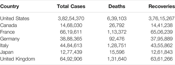 The volatility, measured as beta, experienced during this time frame was much higher than usual, as opined by many other authors (Narayan et al., 2020; Narayan et al., 2021; Zhang et al., 2021). The numerous reasons that exacerbated the higher volatility triggered by COVID-19 included nationwide lockdowns, increasing unemployment, plummeting consumption, unavailability of blue-collar workers, artificial clogging of the supply chain channels, and the mellow financial markets (Sharma et al., 2020). The equity stock markets (Harvey, 1989) mirrored the ground conditions and fluctuations of the real economy during the pandemic. Nonetheless, our empirical results are contradicted by a few authors who opine that the impact of COVID-19 is a short-term one (H. Liu et al., 2020), and it will reverse on its own. Assuming January 1 to be the start date, the leading indices of the G7 nations fell close to 35% by March 23, 2020. On an annualized CAGR basis from January 1, 2020 to August 24, 2021, these indices have given a return of ∼10% (Yahoo, 2021). Our results agree with the findings of a few authors (H. Liu et al., 2020). The importance of the negative impact of the surge in coronavirus infections on equity market movements in G7 nations is emphasized in these findings. In line with a few others, we observed that short-term correlation among confirmed COVID-19 cases in the United States and the S&P 500 was significant in all-time frequencies (Sharif et al., 2020). Ever since the major drop in March 2020 in the equity markets and the American Federal Reserve, USFED’s expansionary quantitative easing policies led to a major reversion in equity prices (Thorbecke, 2020). The rally in the indices of G7 nations was fueled due to the easy money and liquidity in the markets instead of the improvement in the fundamentals in the underlying trades (Rebucci et al., 2020). A few have stated that the variation in returns in each country has been directly correlated with the intensity of the outbreak in the respective country (J. Liu et al., 2020). By March 23, 2020 YTD, the S&P 500 was down by 37%, the S&P/TSX Composite Index for Canada had lost 34%, the French CAC was down by 35%, the German DAX was down by 34%, and the Italian IT40 had lost 34% in line with the other G7 nations while the Nikkei 225 of Japan was down 28% YTD. The fall in equity markets resonated with the gloomy investor opinion, plummeting by greater margins than the United States Sub-Prime financial crisis of 2008 (Mazur et al., 2021). It has been projected that the recovery in the economy will be slow in the G7 nations as it will be for the rest of the world. The impact of the COVID-19 pandemic has been forecasted to be very persistent and negative (Foroni et al., 2020; UNCTAD, 2020). The slowdown in commercial activities results in large-scale unemployment rendering a multiplier impact on the consumption and other wings of the economy. This has a negative bearing on the financial and commodity markets and a similar impact on private capital formation as well (Ruth Lea, 2021).