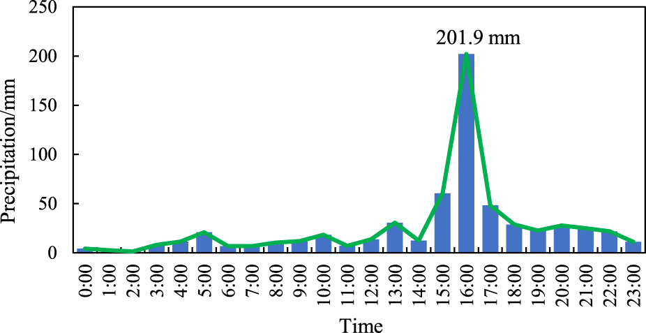 There was a large-scale rainstorm event in central and northern Henan Province of China from July 17 to July 22 in 2021, mainly involving Zhengzhou city, Kaifeng city, Zhoukou city, Xinxiang city, Luohe city, Pingdingshan city, Xuchang city, Hebi city, Anyang city, Jiaozuo city, etc (Shi et al., 2021; Zhang et al., 2021; Dorina et al., 2022). According to statistics, there were 43 meteorological stations with precipitation exceeding 400 mm, 154 meteorological stations exceeding 300 mm, 467 meteorological stations exceeding 200 mm, and 1 426 meteorological stations exceeding 100 mm in Henan Province from 8:00 on July 18 to 12:00 on 20 July 2021. The accumulated precipitation of 73 meteorological stations in Zhengzhou city exceeded 500 mm, and the maximum cumulative precipitation was 875 mm at the Baizhai meteorological station in Xinmi County from 18:00 on July 18 to 0:00 on 21 July 2021. The daily precipitation at the meteorological stations in Zhengzhou, Dengfeng, Xinmi, Xingyang, and Gongyi exceeded the extreme value from the meteorological records. The precipitation at Zhengzhou meteorological station reached 201.9 mm at 16:00-17:00 on July 20 (Figure 1), exceeding the extreme value of hourly precipitation on land in China (http://data.cma.cn).