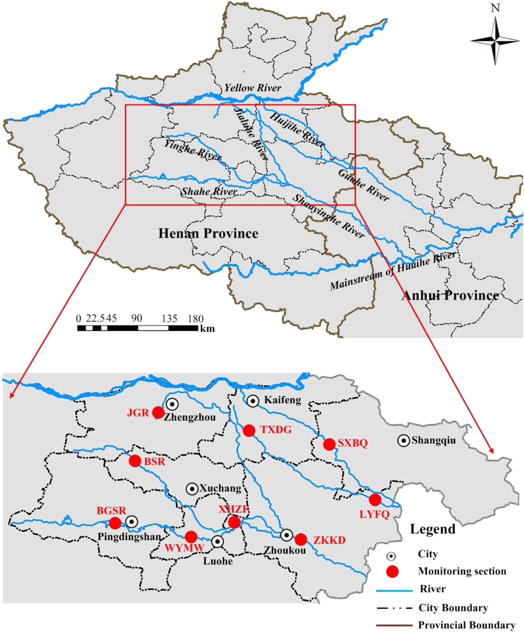 Water system map of the Huaihe River Basin in Henan Province and distribution of monitoring stations.
