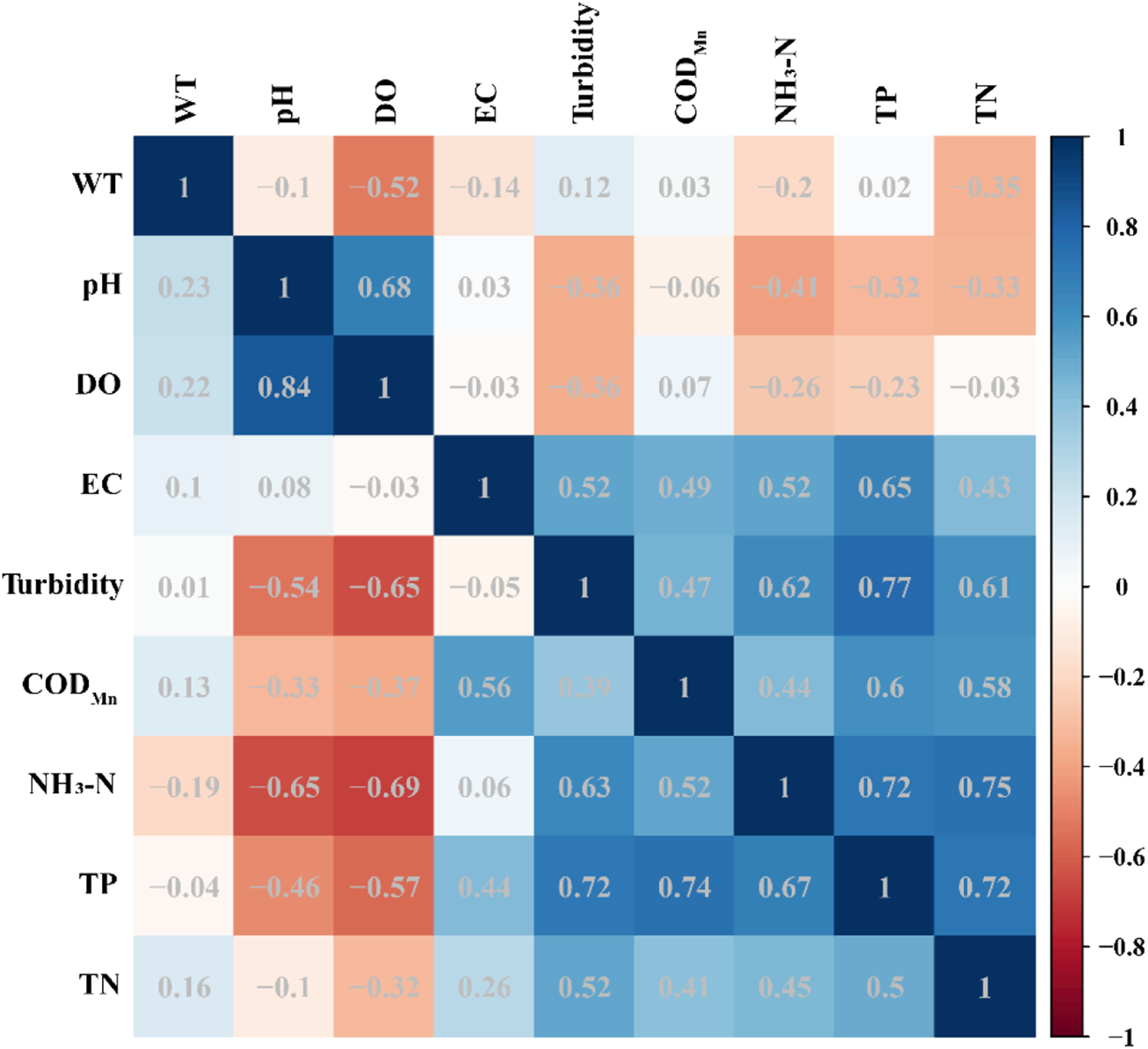 | Water quality indicators | WT (°C) | pH | DO (mg L−1) | EC (μS cm−1) | Turbidity (NTU) | CODMn (mg L−1) | NH3−N (mg L−1) | TP (mg L−1) | TN (mg L−1) | |