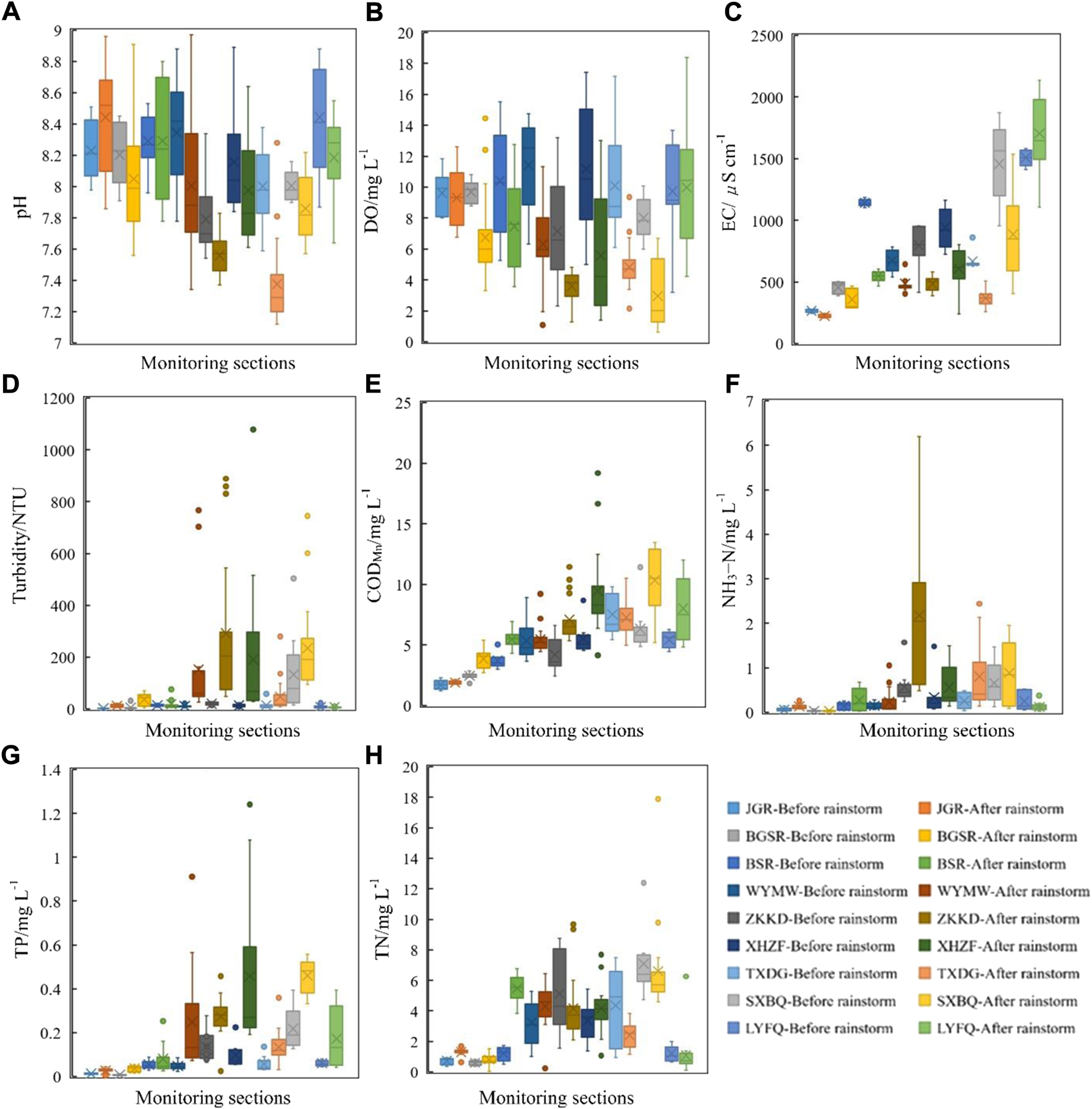 The differences of the pH (A), DO (B), EC (C), Turbidity (D), CODMn(E), NH3−N (F), TP (G), and TN (H) at each monitoring station before and after the rainstorm. Boxplots show the maximum, upper-quartile, median, lower-quartile, and minimum of the distribution across sites.