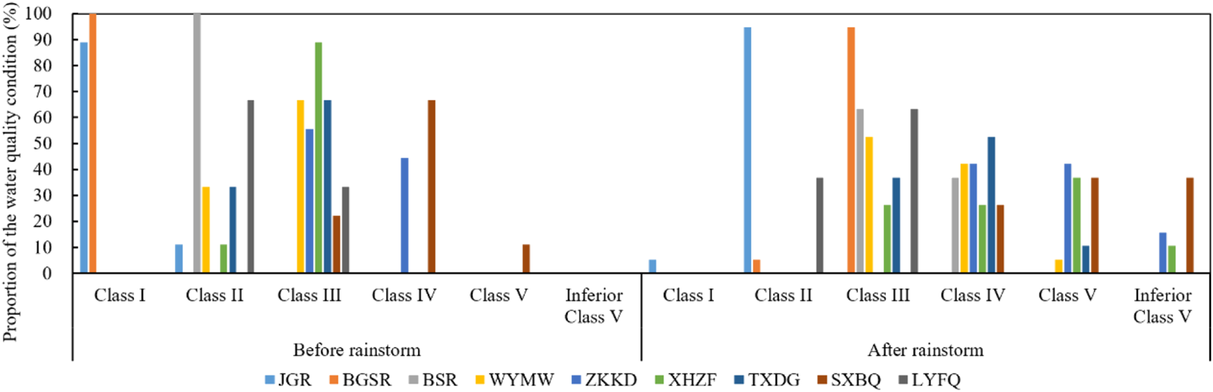 The IWq distribution in the monitoring section before and after the rainstorm was analyzed (Figure 8). The results showed that the water quality condition at BSR increased by 36.84% to Class IV, and the water quality condition in Class IV and Class V increased by 42.11 and 5.26%, respectively, at WYMW. The water quality condition at ZKKD increased by 42.11 and 15.79% to Class V and Inferior Class V, respectively, and the water quality condition of Class IV, Class V and Inferior Class V increased by 26.32, 36.84 and 10.53%, respectively, at XHZF. The water quality condition at TXDG increased by 52.63 and 10.53% to Class IV and Class V, respectively. The water quality condition at SXBQ increased by 25.73 and 36.84% to Class V and Inferior Class V, respectively. After the rainstorm, the water pollution of each monitoring section increased, indicating that the rainstorm had a greater impact on river water pollution. The water quality of the reservoir was better, indicating that the larger the water area was, the smaller the impact of the rainstorm on water pollution.