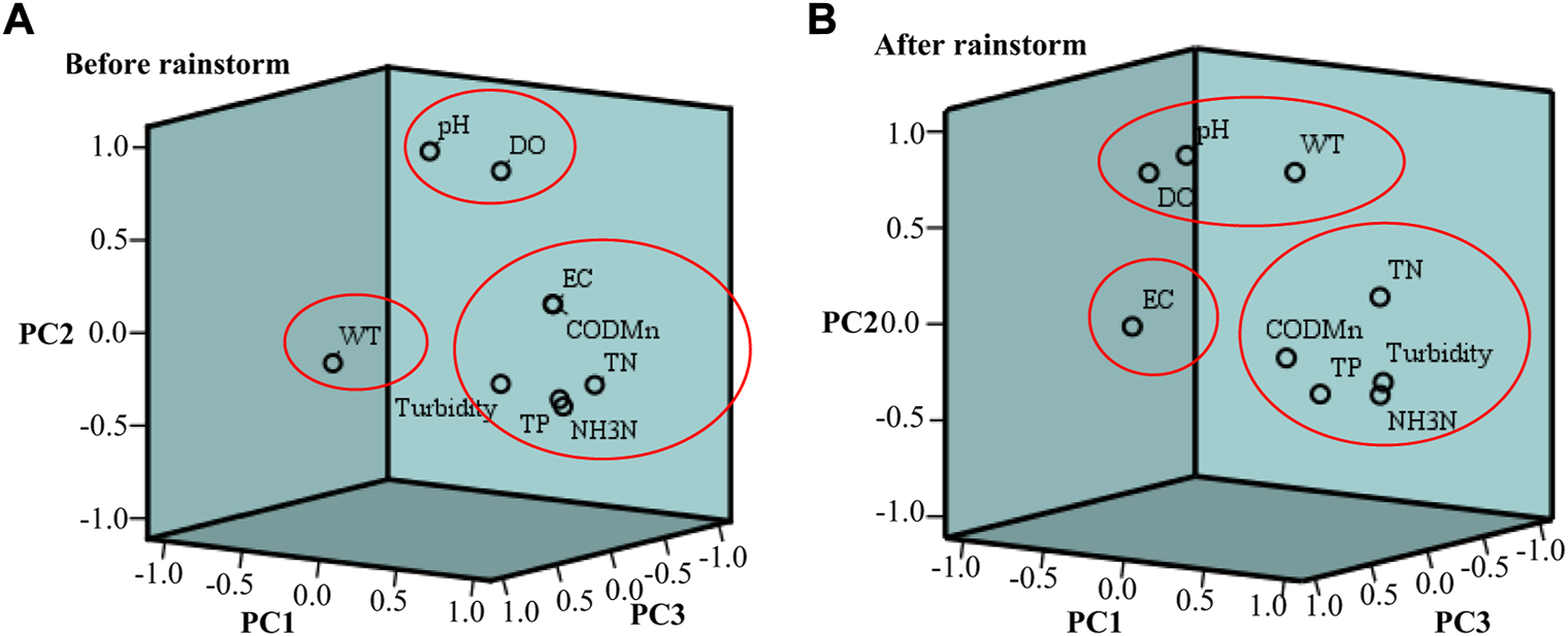 According to the principal component analysis, the Kaiser-Meyer-Olkin (KMO) values were 0.566 and 0.686 before and after the rainstorm, respectively, indicating that the data series of the water quality indicators before and after the rainstorm was suitable for principal component analysis. The eigenvalues of the main components and the contribution rates of variances were obtained in the Henan section in the Huaihe River Basin before and after the rainstorm (Table 3), and the components with eigenvalues greater than 1 were identified as their principal components according to relevant studies (Zhang et al., 2017). Therefore, three principal components were extracted before and after the rainstorm, and the contribution rates of cumulative variance reached 72.361 and 72.75%, respectively.