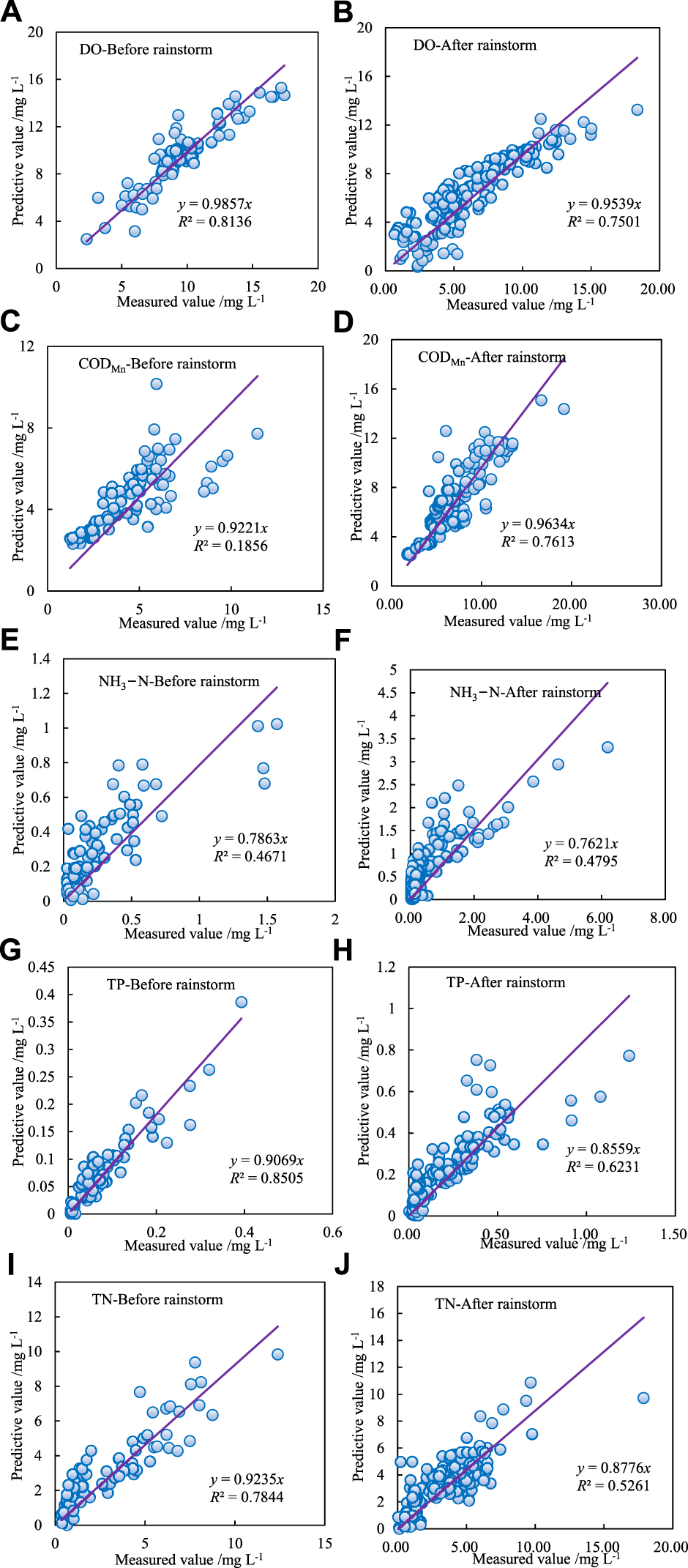 In summary, the correlations of water quality indicators were affected by the rainstorm to a certain extent in the Henan section in the Huaihe River Basin, indicating that a large number of pollutants were washed and eroded into the river water body through runoff when rainstorms occur, which had a greater impact on the river water quality indicators. Therefore, to make timely pollution control and prevention measures, the water quality indicators should be monitored for sudden rainstorms.
