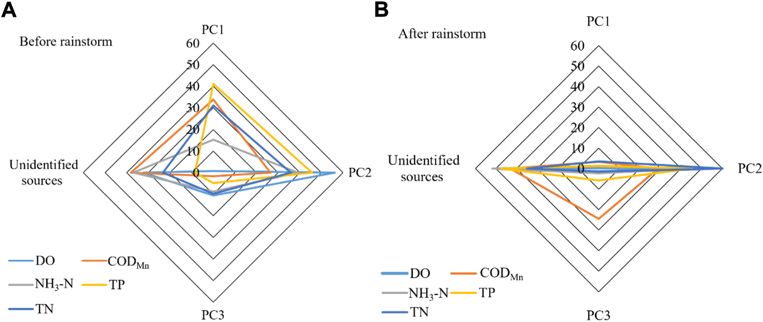 In recent years, the APCS-MLR method has been widely used in the analysis of water pollution sources in surface water, groundwater and sediment; however, there have been few studies on the analysis of river water pollution sources before and after rainstorms, and the contribution rates of water pollution sources before and after a rainstorm were calculated and compared in this study. For example, the sources and main contributions of the surface water pollutants were quantitatively analyzed in the Tuohe River Basin, Caohai and Waihai in Dianchi Lake, upstream of the Yangtze River, three major rivers in South Florida, the Min River Basin and the coastal water in Hong Kong (Gholizadeh et al., 2016; Liu et al., 2019b; Zhang et al., 2020b; Cheng et al., 2020; Du et al., 2020; Hou et al., 2021). The groundwater pollution sources were identified and analyzed in the Hunhe River alluvial fan, Limin Development Zone of Harbin City, Tongchuan City, the typical mixed land-use area in southwestern China (Meng et al., 2017; Meng et al., 2018; Zhang et al., 2020a; Li et al., 2021). The sources of heavy metals in the surface sediments of the Baoxiang River in Dianchi Lake were analyzed by the APCS-MLR (Shi et al., 2020), the sources of N and P pollution were identified, and the contributions of each potential pollution source were apportioned in lowland urban rivers located on the northern Hangzhou-Jiaxing-Huzhou Plain in northern Zhejiang Province (Shen et al., 2021).