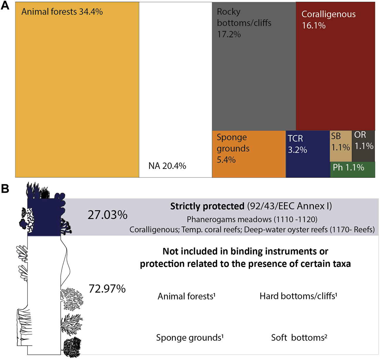 Proportion of mesophotic habitats studied in the Mediterranean Sea (A) and the proportion of records targeting habitats included in the current International Policy Framework (B). 1Habitats defined as VME in FAO, 2009. 2Only soft-bottom habitats (1110-Sandbanks) shallower than 20 m depth are listed under the Habitats Directive (Romão, 1996). TCR: temperate coral reefs; SB: soft bottom; OR: deep-water oyster reef; Ph: Phanerogam meadows; NA: not available.