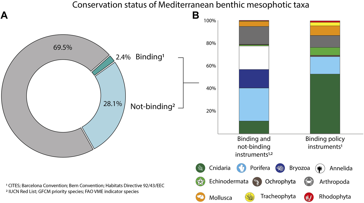 Portion of benthic mesophotic taxa included in the International Legal Framework, considering both binding and not-binding instruments (A), and percentage contribution of the identified Phyla to taxa listed under legal instruments (B).