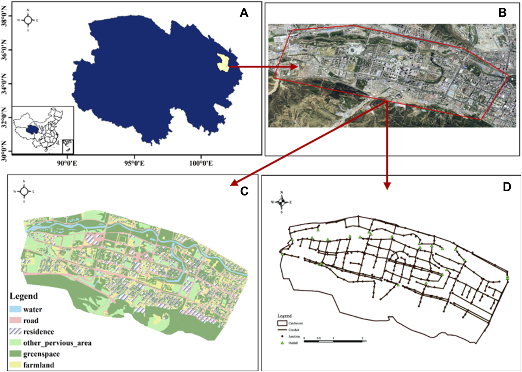 (A) Geographical location of the study area; (B) Image picture of the study area; (C) The land use of the study area; (D) The rain pipe network of study area.