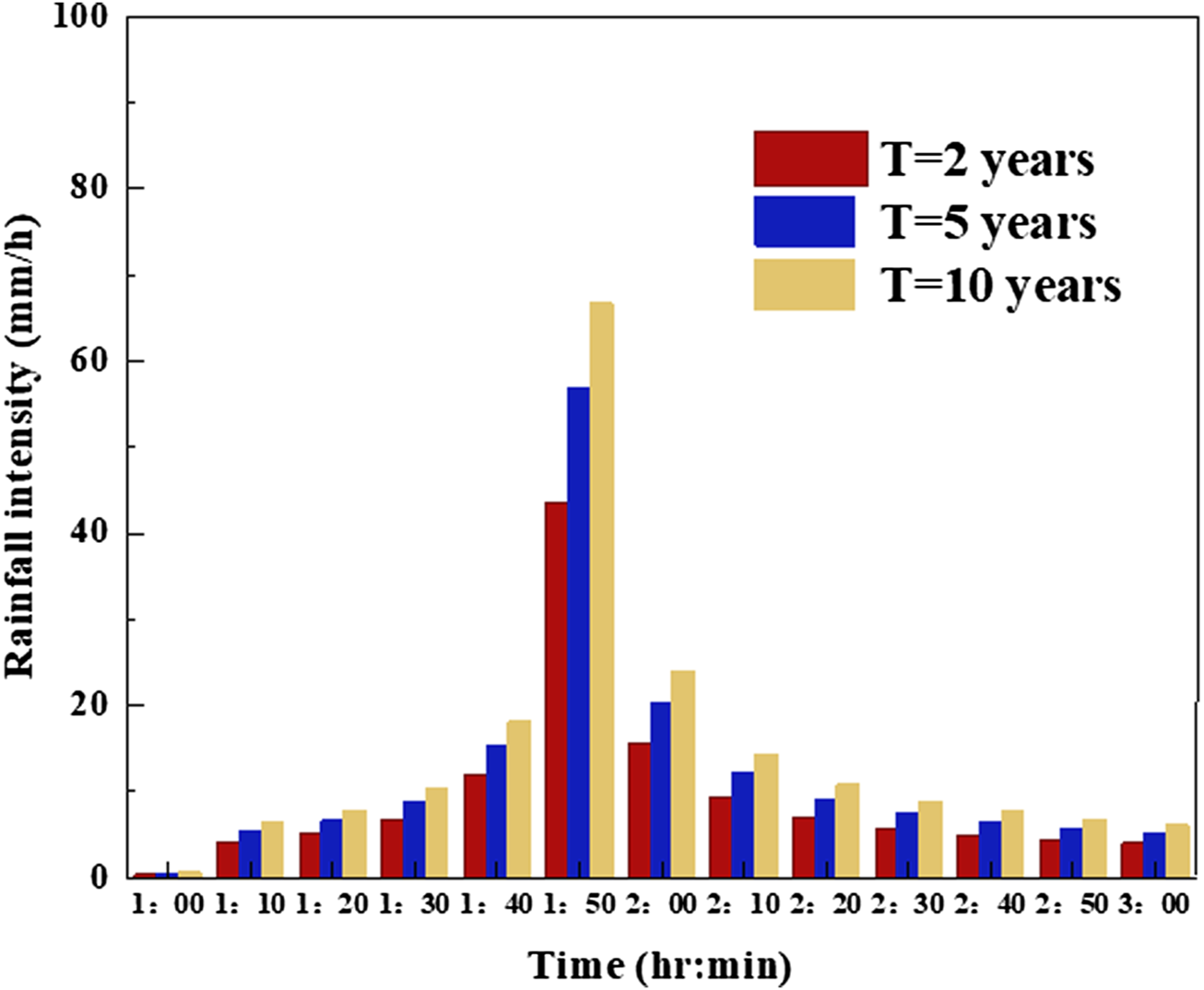 Rainfall distribution of Chicago rainfall patterns during three return periods.