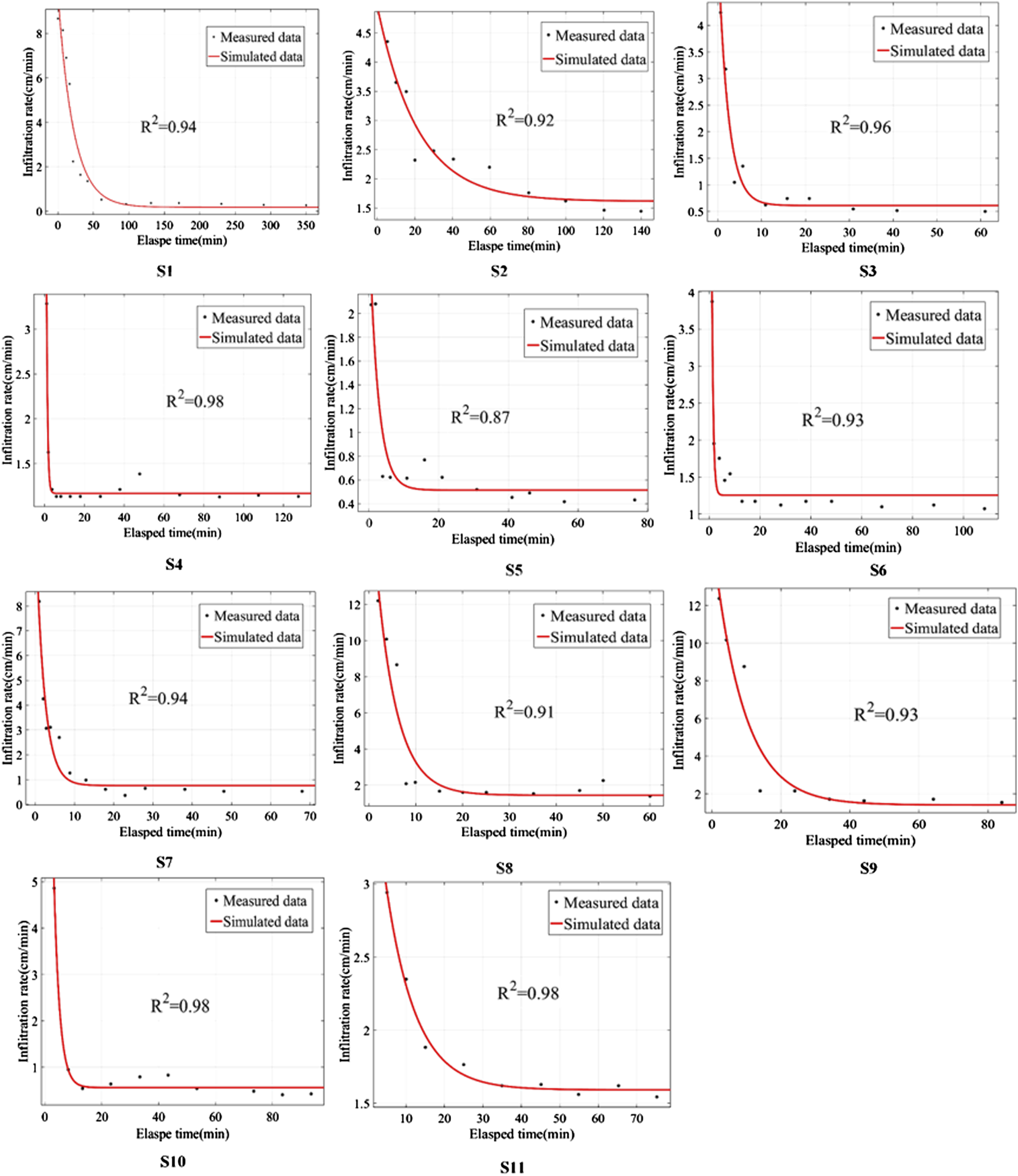 The surface runoff is calculated by solving both Manning’s equation and the water balance equation. The Horton model and the dynamic wave method simulate the infiltration process and the hydraulic calculations. Firstly, to determine the parameters of Horton’s model, this paper conducted a soil infiltration experiment. A total of 11 sites within the study area were selected and using the experimental results, the Horton parameters were obtained by the infiltration curve which showed in Figure 5.