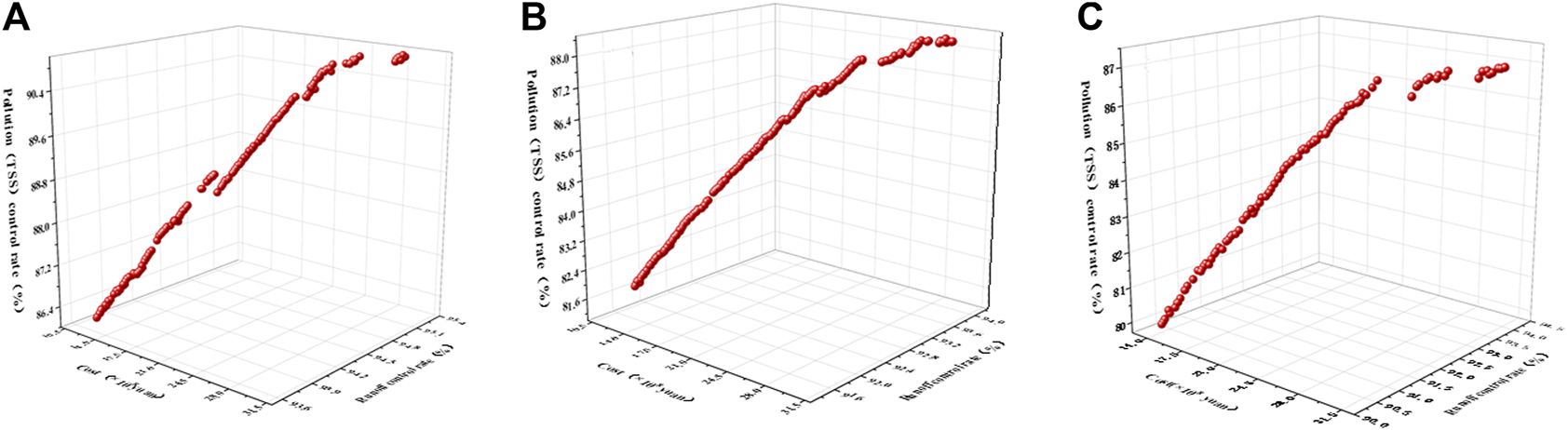 Determining the optimal scheme with a cost-benefit effect is a complex multi-objective optimization problem, which requires considering the tradeoff between different objectives, such as total runoff volume, pollutant loads, and costs (Xu et al., 2017; Wang et al., 2022). At present, a few researchers have conducted studies on the multi-objective optimization layout (She et al., 2021; Gao et al., 2022; Yao et al., 2022); Eckart et al. (2018) proposed and developed a coupled optimization and simulation model by linking the Storm Water Management Model (SWMM) to the Borg Multi-objective Evolutionary Algorithm (Borg MOEA). They selected the minimizing peak flow in storm sewers, thus reducing the total runoff and minimizing the cost in order to find the optimal LID plan. Liu et al. (2019) developed an optimization tool (SWAT-BMP Optimization Tool 1.0) to enhance the types, quantities, and spatial locations of agricultural BMPs. As a result, the researcher was able to obtain maximum reductions in pollutant loadings with minimum costs. Leng et al. (2021) used SWMM and Non-dominated Sorting Genetic Algorithm Ⅱ (NSGA-Ⅱ) to obtain the cost-effectiveness curves in green-grey infrastructures synchronous optimization under different combination of green and grey infrastructures and different future scenarios which developed based on predicted land use and rainfall data. Wan et al. (2022) present a multi-objective optimization model, which involved three dimensions of objectives, namely cost, facility efficacy, and landscape quality, to accommodate real-world practices of sponge cities.
