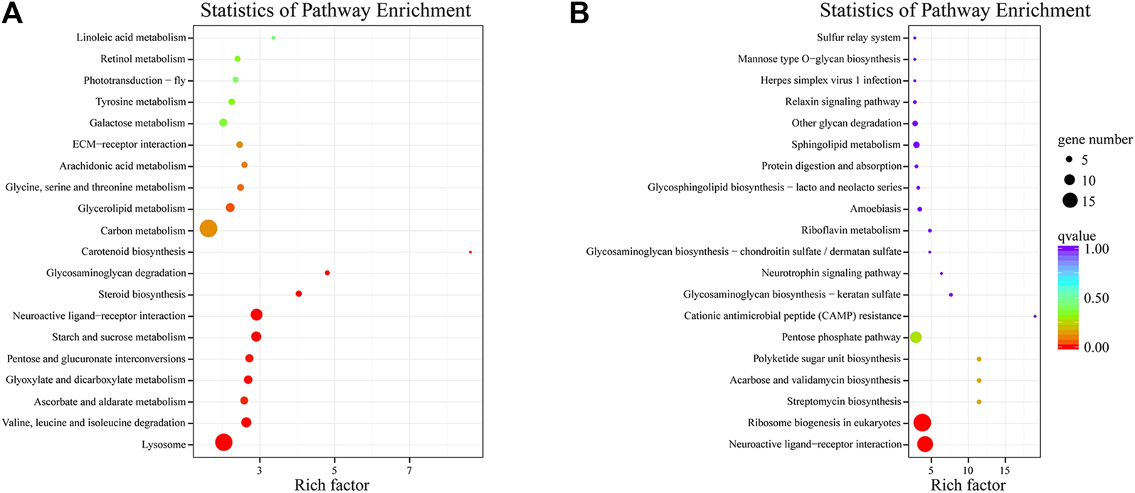 KEGG pathway analysis of DEGs. Note, Y-axis represents pathways and X-axis represents the enrichment score. (A) After exposure to fipronil, the KEGG pathway enriched by DEGs was up-regulated. (B) After exposure to fipronil, the KEGG pathway enriched by DEGs was down-regulated.