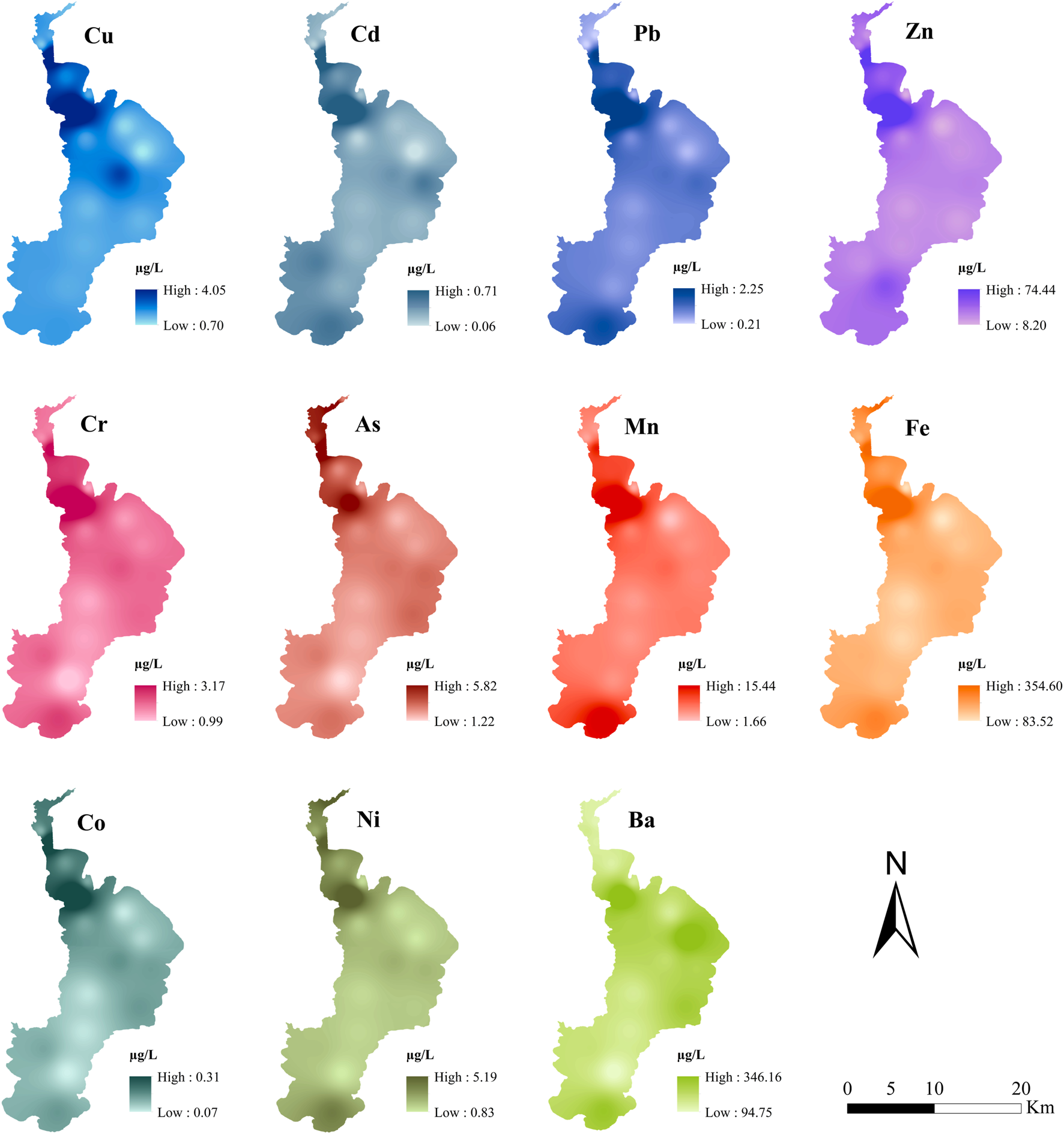Spatial variations of heavy metal concentration in surface water, including Cu, Cd, Pb, Zn, Cr, As, Mn, Fe, Co, Ni, and Ba. Ag was not presented because of its low concentration in surface water.