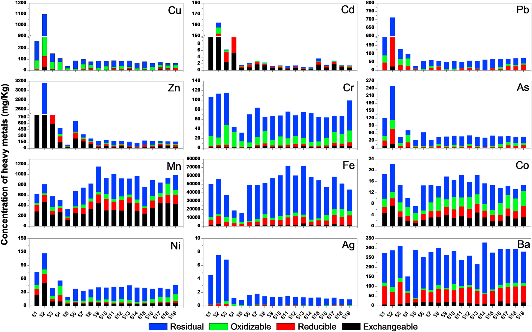 Heavy metal concentrations in sediment samples. Blue: residual fraction; Green: oxidizable fraction; Red: reducible fraction; Black: exchangeable fraction.