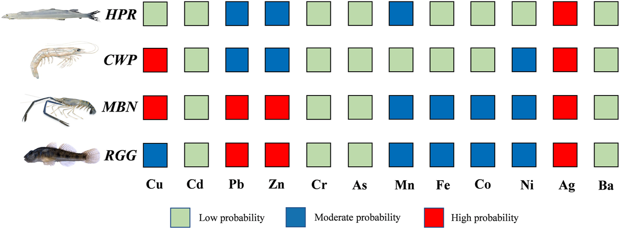Bioaccumulation factor of organisms to heavy metals in surface water (BAF-water). Green: low probability; Blue: moderate probability; Red: high probability.