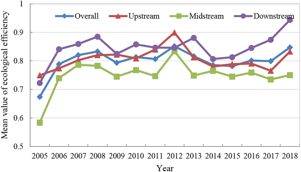 Mean variation of eco-efficiency in the Yellow River Basin from 2005 to 2018.