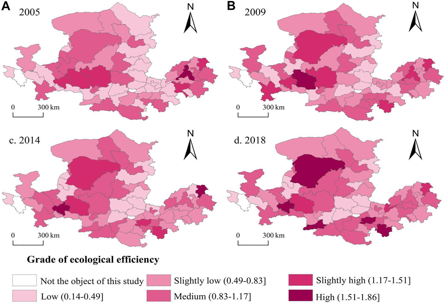 The hierarchical spatial distribution map of urban ecological efficiency in the Yellow River Basin at four times (2005, 2009, 2014, and 2018) shows a large difference in the hierarchical spatial distribution of ecological efficiency among cities (see Figure 2). However, after 2009, the hierarchical difference of urban ecological efficiency gradually narrowed, and the trend showed significant characteristics of watershed spatial dependence. Specifically, in 2005, the level of ecological efficiency in the upper, middle, and lower reaches of the Basin was generally low; 39 cities were at a low or lower level, and no significant watershed spatial characteristics were identified. In 2009 and 2014, the overall ecological efficiency level significantly improved. There were 35 and 32 cities at low or lower levels, respectively, and a large range of high-value areas had formed in upstream and downstream areas. By 2018, 11 cities were at a low level and five cities were at a high level. But the ecological efficiency level of some cities decreased compared with 2014, including Dongying, Weinan, Tongchuan, Taiyuan, and Baotou.