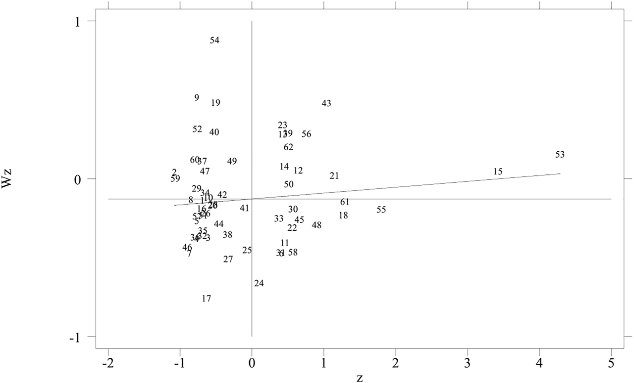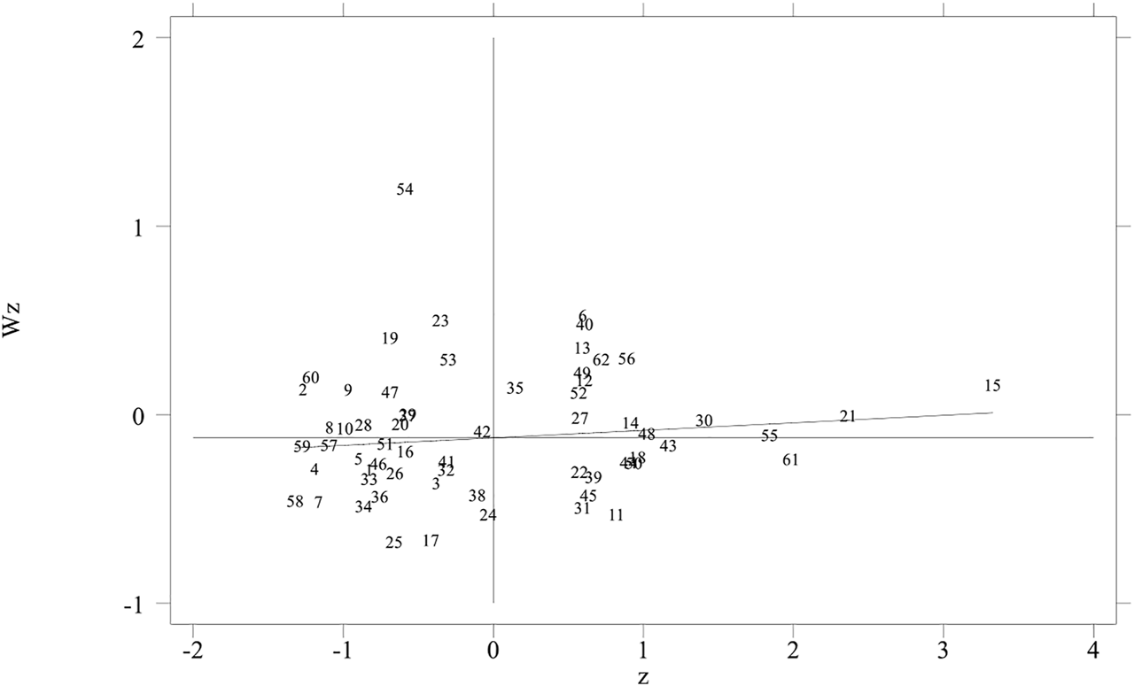 The global Moran index examines the spatial agglomeration of the whole region. To observe the spatial agglomeration around a particular region, local Moran’s I can be used, and the specific form is shown in Formula (7) (Tepanosyan et al., 2019):