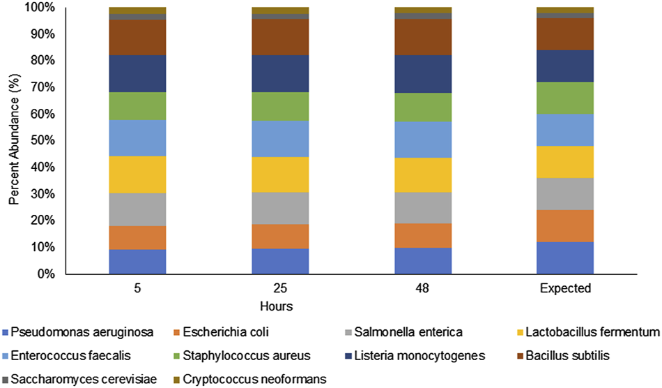Percentage of microbial composition observed by WIMP from nanopore sequencing of the ZymoBIOMICS microbial community DNA standard using the RAD004 kit at different time intervals (5, 24 and 48 h) showing that the composition remained stable across those tested time frames and in a similar composition to the expected proportions.