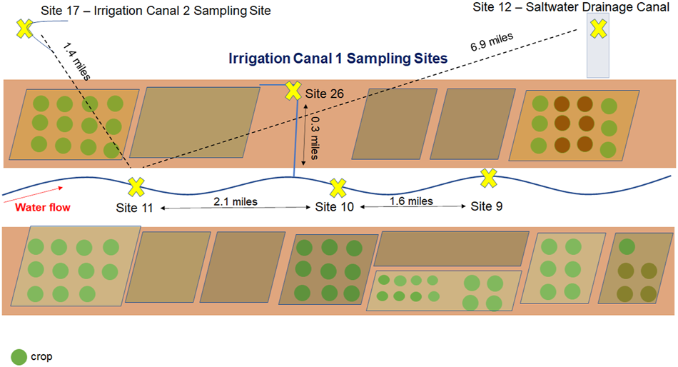 Map of sampling sites. Agricultural water samples were collected along irrigation canals and a saltwater drainage canal in the Southwestern United States. The relative (solid) and direct (dotted) distance between sampling sites 9, 10, 11, 12, 17, and 26 are shown.