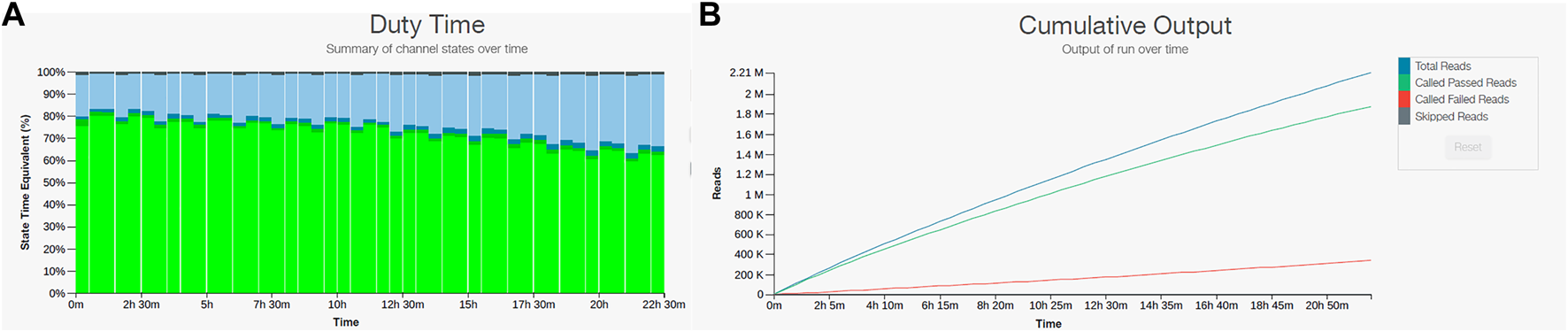 Nanopore sequencing output for sample 9 using the LSK109 ligation kit. (A) Pore sequencing and availability remained above 60% for the 24-hour sequencing run. (B) Cumulative output of the LSK109 kit showed more than 85% of total reads passed the quality filter.