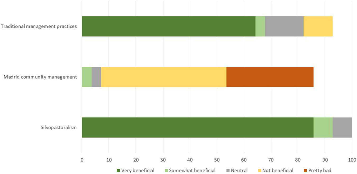 FIGURE 3. Perception of different management practices’ impacts on woodlands by local people from La Puebla de la Sierra. Upper graph: Perception of benefit from diverse traditional management practices as clearing, browsing, pruning etc.; Middle graph: Perception of benefit from management practices used by the Madrid Autonomous Community; Lower graph: Perception of benefit from traditional silvopastoralism management.