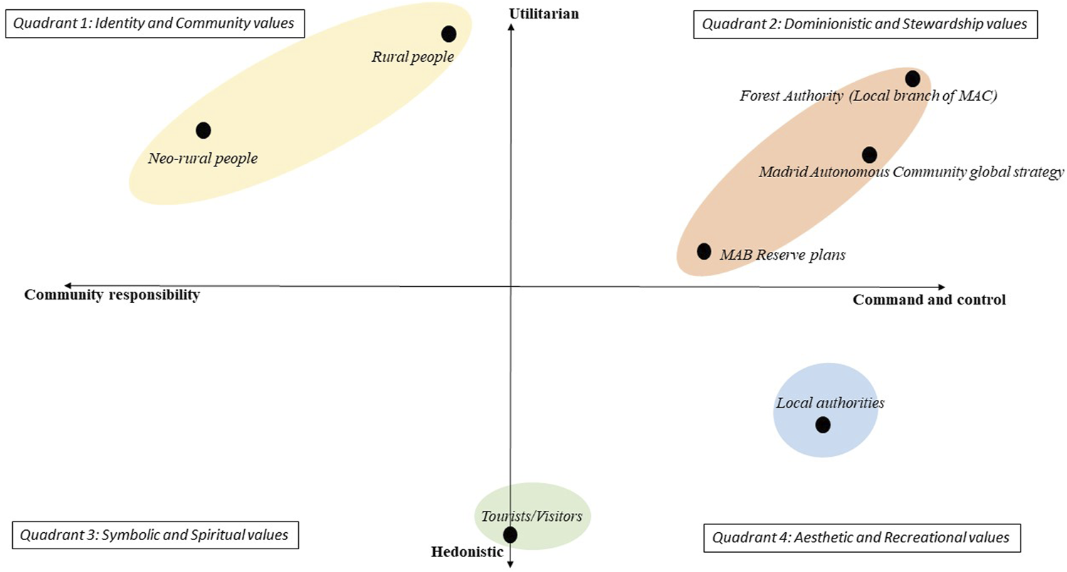 In quadrant 2, the different “political” actors demonstrate a strong preference for dominionistic and stewardship values. There is a subtle gradient however with Forest Agency, being more utilitarian, while MAB Reserve authorities prefer a more holistic management plan. The geographic disconnection existing between Puebla de la Sierra and the political decision-makers limits the development of relational values, such as identity. Moreover, the global vision of these authorities is more aligned with urban expectations and visions from nearby Madrid city, which are prioritized by the MAC’s Forest Agency, and are out of step with local community needs.