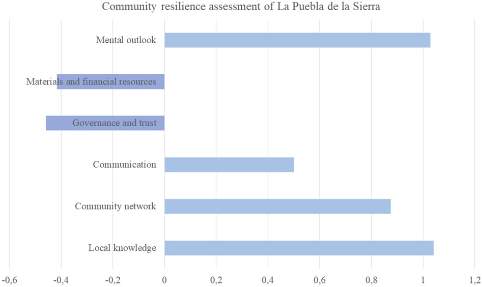 FIGURE 5. Community resilience assessment of La Puebla de la Sierra (Very positive = 2; Positive = 1; Neutral = 0; Negative = −1; Very negative = −2).