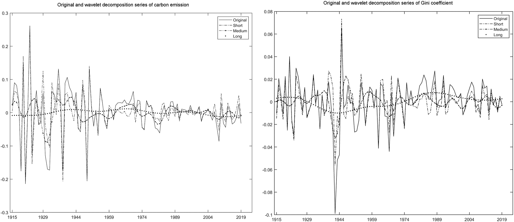 In this section, we use the wavelet decomposition method following Kassouri et al. (2022) and Bilgili et al. (2021) to extract the short, medium- and long-term factors from the original time series of income inequality and carbon emissions. It enables us to investigate the emission-inequality nexus at different periodic scales. The wavelet decomposed and the original time series are plotted in Figures 1, 2, which reflect the varied periodic fluctuation characteristics of these series.