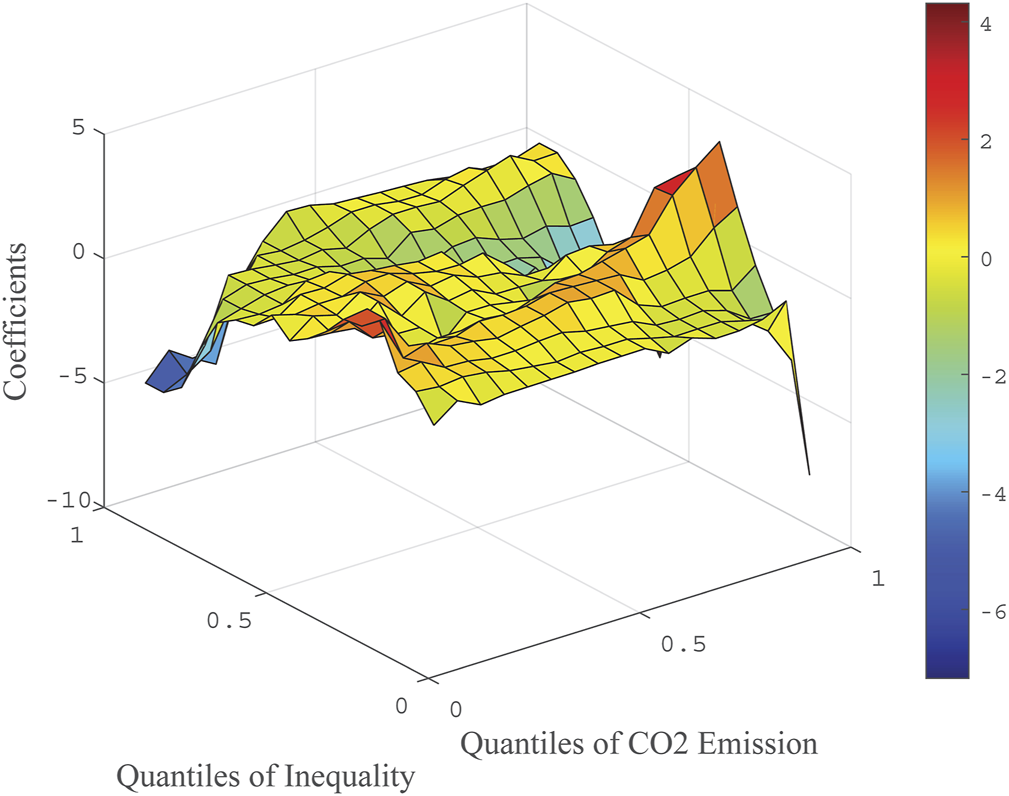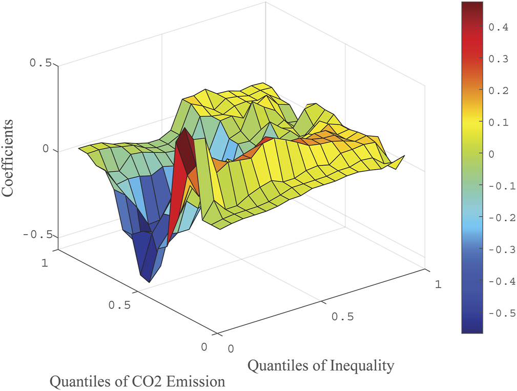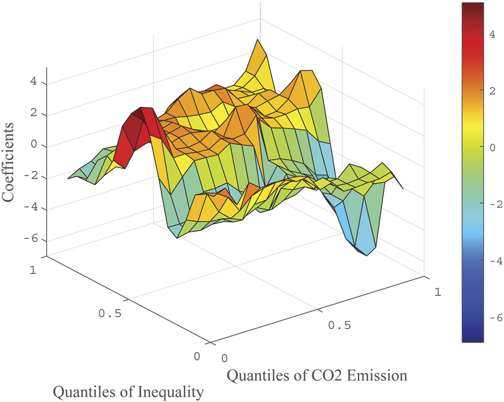 Subsequently, the quantile-on-quantile regressions are adopted to empirically investigate the interaction between income inequality and carbon emission of sample countries. This method has been widely used in various fields of finance and economics, such as energy consumption (Shahbaz et al., 2018), tourism economics and stock volatility (Gupta et al., 2018; Mishra et al., 2019). The main advantage of this technique is to capture the association at different quantiles of the income inequality and emissions. In this way, we can know how the upper, lower, and middle quantiles of income inequality affect the upper, lower, and middle quantiles of the emission differently. In addition, we can divide the segments that require variables among different numbers of quantiles according to our own requirements.