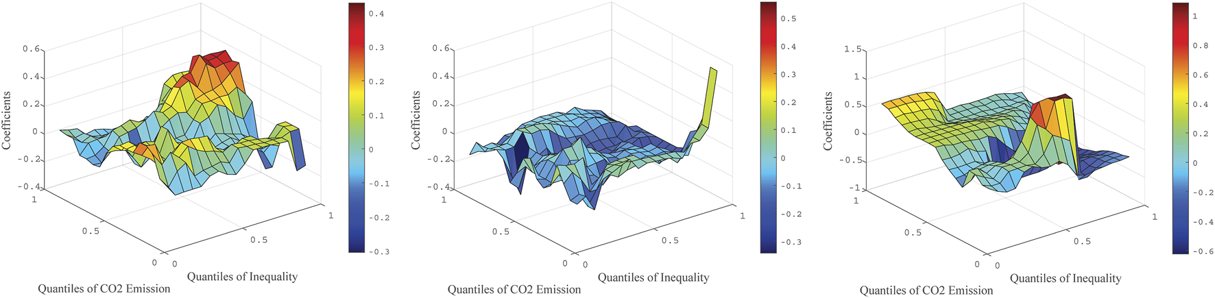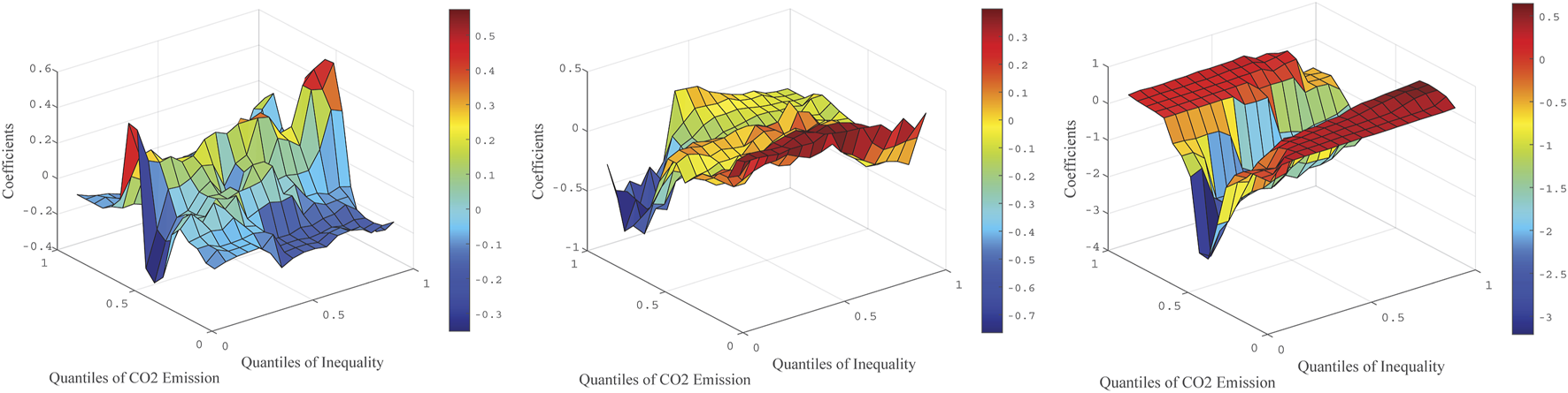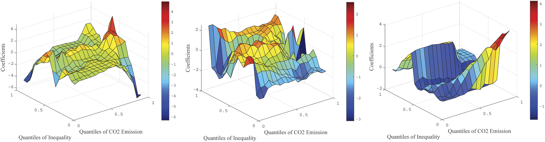 The estimated results in this paper are shown in Figures 3–10. Figures 3–6 display the impact of income inequality on carbon emissions in the U.S. and France. Figures 7–10 display the effect of carbon emission on income inequality in France and the U.S. Throughout the graphs, the z-axis indicates the effect of the th quantile of Gini index on the th quantile of carbon emission. We can find two different relationships by comparing the results of France and the U.S.