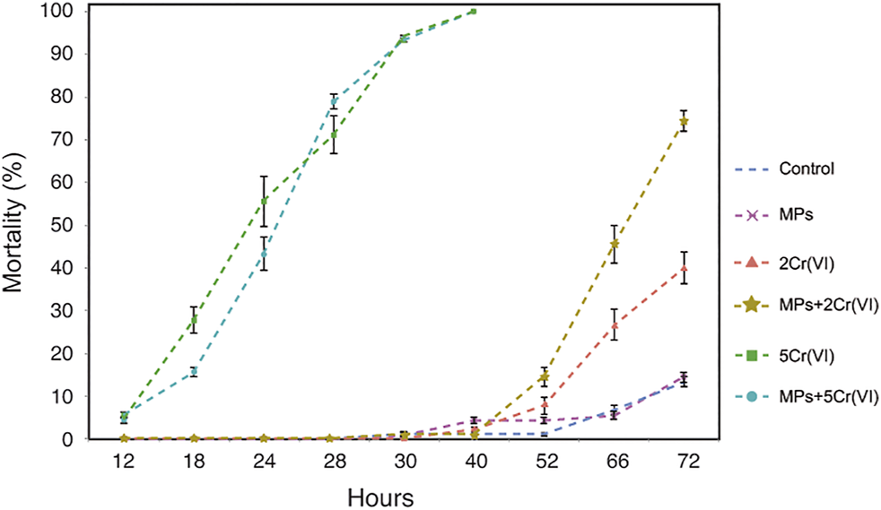 Mortality of D. Magna exposed to MPs, two different concentration of Cr (VI), and the combined treatment of MPs with both 2 and 5 ppm of Cr (VI) over the course of 72 h. The control treatment were not exposed to either MP or any concentration of Cr (VI).