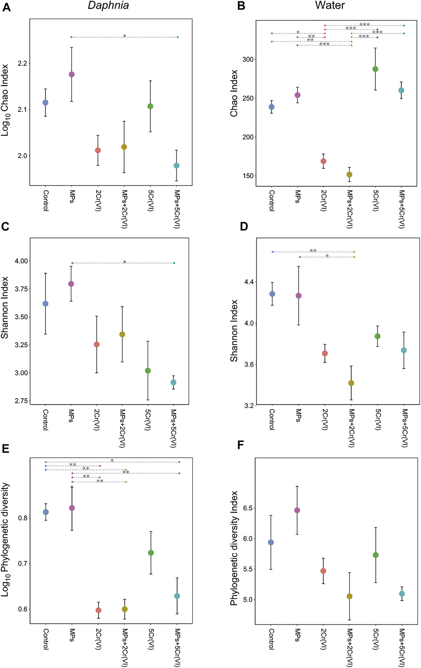 Changes in microbial diversity indexes, in Daphnia (left panel) and in the water (right panel), measured as Chao index (A,B), Shannon index (C,D), Phylogenetic diversity index (E,F), to the exposure to MP and/or Cr (VI). The control replicates were not exposed to either MP or Cr (VI). Error bars represent standard error. The violin shape represents the kernel density, showing the probability density of the data. Significant differences between treatments were tested using post-hoc Tukey tests and are indicated with asterisks (∗∗∗: p-value < 0.001; ∗∗: 0.001 < p-value < 0.01; : p-value < 0.05; •: 0.05 < p-value < 0.09).