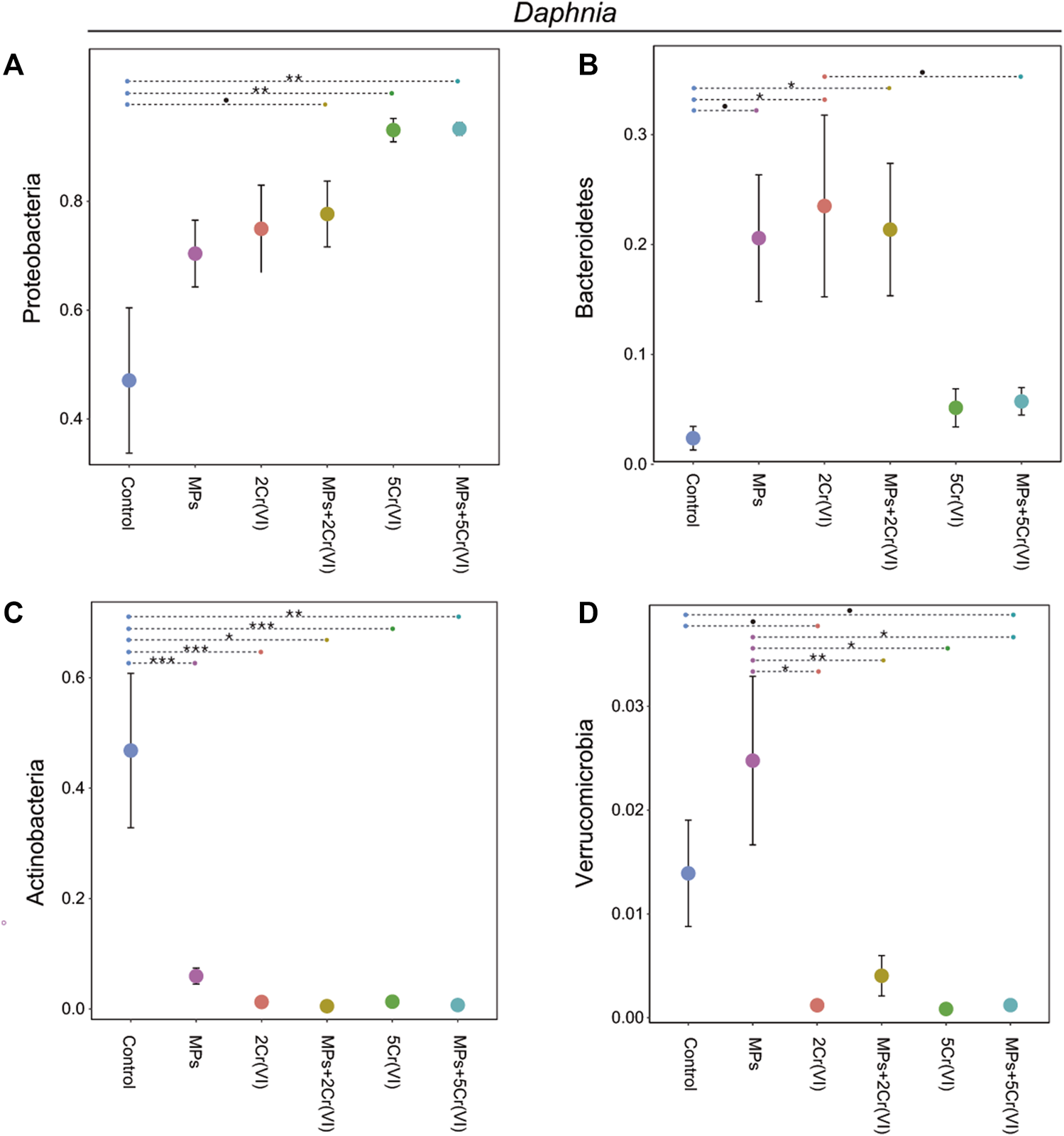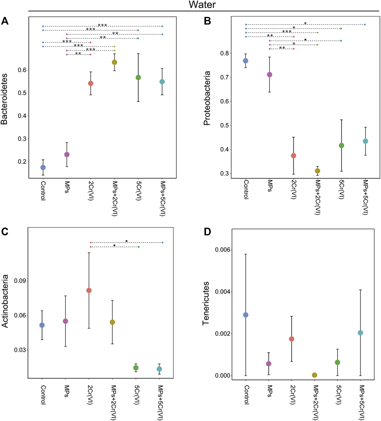 The main microbial phyla in Daphnia was significantly affected by MP, Cr (VI) and the interaction between MP × Cr (VI) (Table 3). On the other hand the four main microbial phyla in the water were only affected by the exposure of Cr (VI) (Table 3). Looking at the individual microbial phyla in Daphnia; the relative abundance of Proteobacteria increased in the presence of Cr (VI) whereas Bacteroidetes was affected both by the exposure to Cr (VI) and by the interaction of MP × Cr (VI) (Table 4). There was also a non-significant effect from MP exposure on Bacteroidetes. Both Actinobacteria and Verrucomicrobia relative abundances was negatively affected by the exposure of MPs alone and Cr (VI) alone (Table 4). The post hoc test showed differences between treatments in all the four main phyla (Figure 4). In the water, only Cr (VI) exposure affected Bacteroidetes, Proteobacteria and Actinobacteria whereas Tenericutes was not affected by any of the factors (Table 4). The post hoc showed significant differences between treatments only in Bacteroidetes and Proteobacteria (Figure 5).