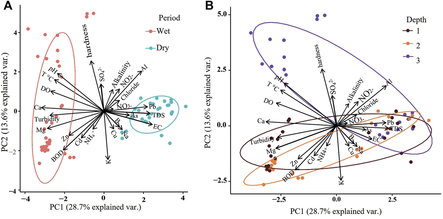 FIGURE 2. Principal component analysis describing the concentration of physicochemical parameters and toxicologically important elements by seasonal period (A) and depth level (B) in Lake Pomacochas. Temperature (T°C), dissolved oxygen (DO), hydrogen potential (pH), electrical conductivity (EC), biochemical oxygen demand (BDO), nitrates (NO3−), nitrites (NO2−), total dissolved solids (TDS), ammonium (NH4+), sulfates (SO42-), chemical oxygen demand (BOD), magnesium (Mg), aluminum (Al), calcium (Ca), sodium (Na), potassium (K), zinc (Zn), cadmium (Cd), copper (Cu), lead (Pb), boron (B), and arsenic (As).